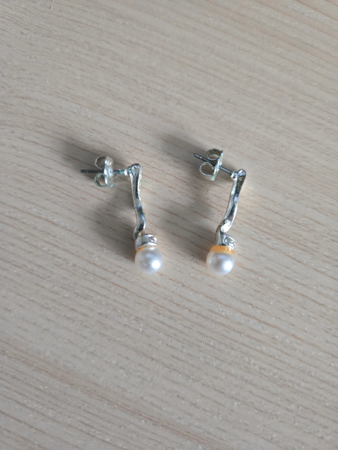 115Selling a pair of elegant pearl drop earrings. They feature a unique, slightly curved silver-tone post with a classic pearl drop. Perfect for adding a touch of sophistication to any outfit!