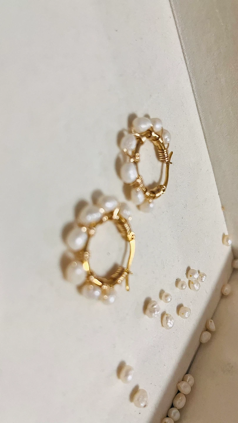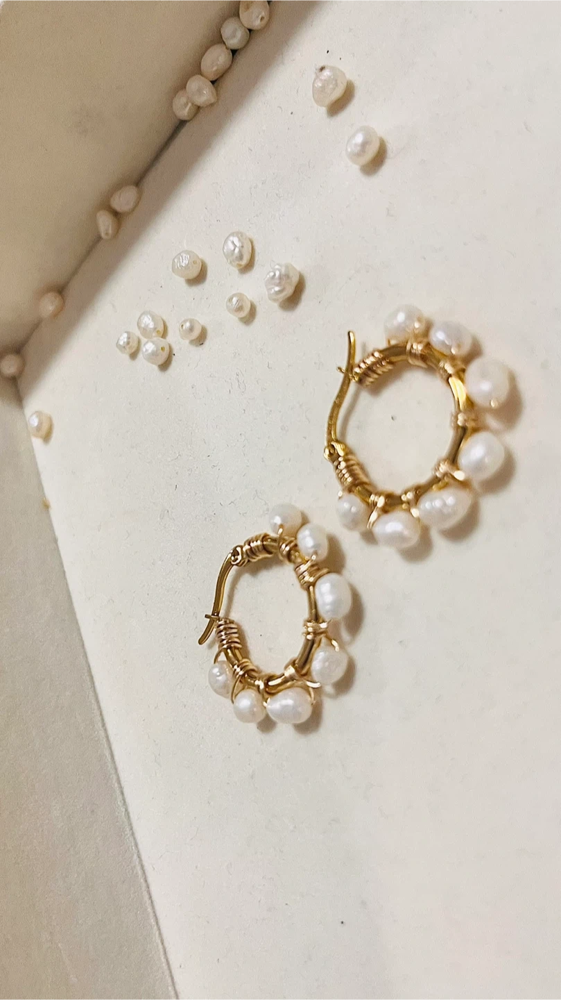 70These are a pair of gold hoop earrings adorned with small, irregular fresh water pearls. They're perfect for adding a touch of elegance to any outfit!