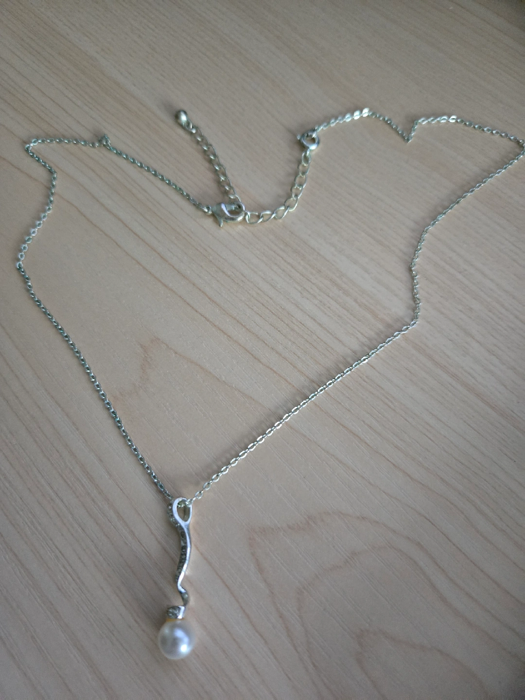 115A lovely silver-tone necklace featuring a delicate chain and a charming pearl pendant. It's in great condition and ready to add a touch of elegance to any outfit!