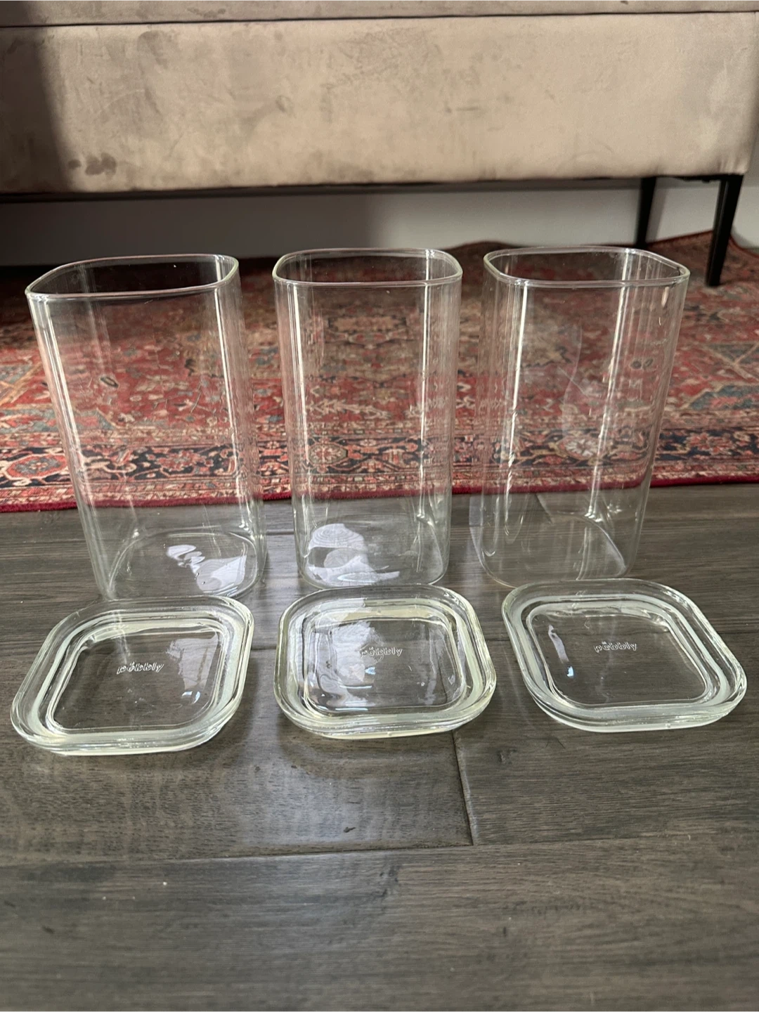 292Selling a set of 3 Pebbly glass food storage containers with lids. These are great for keeping your pantry organized or storing leftovers in the fridge! They're in excellent condition and ready for a new home 7 inches high by 4x 4 All 3 for $10 - originally purchased from the bay Fastest pick up - moving