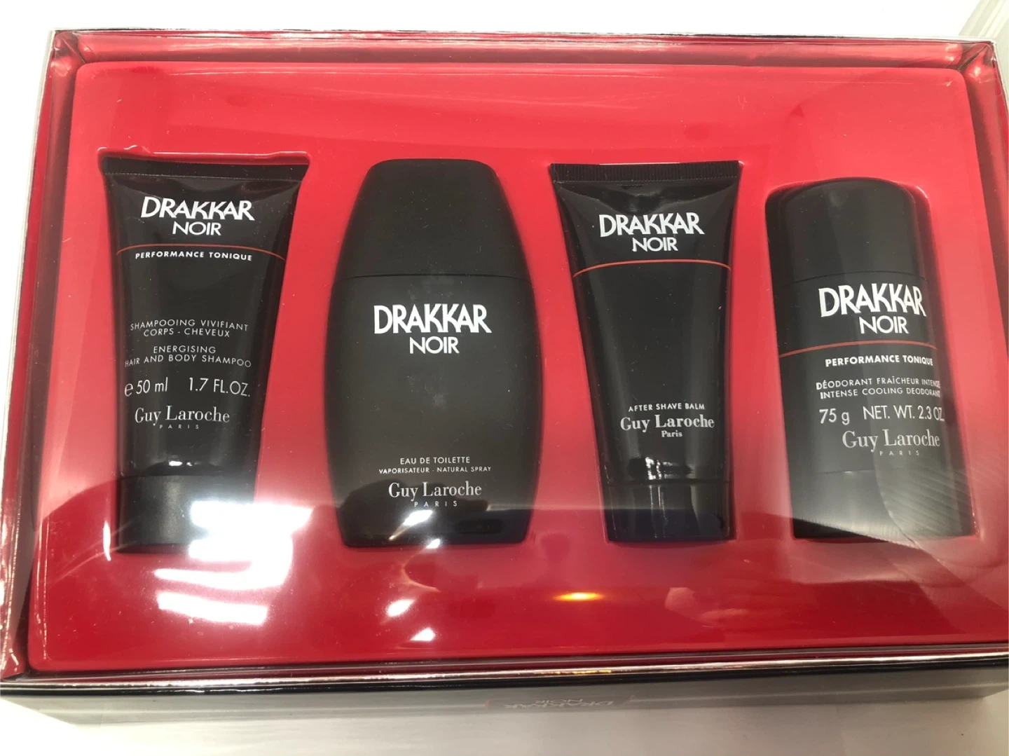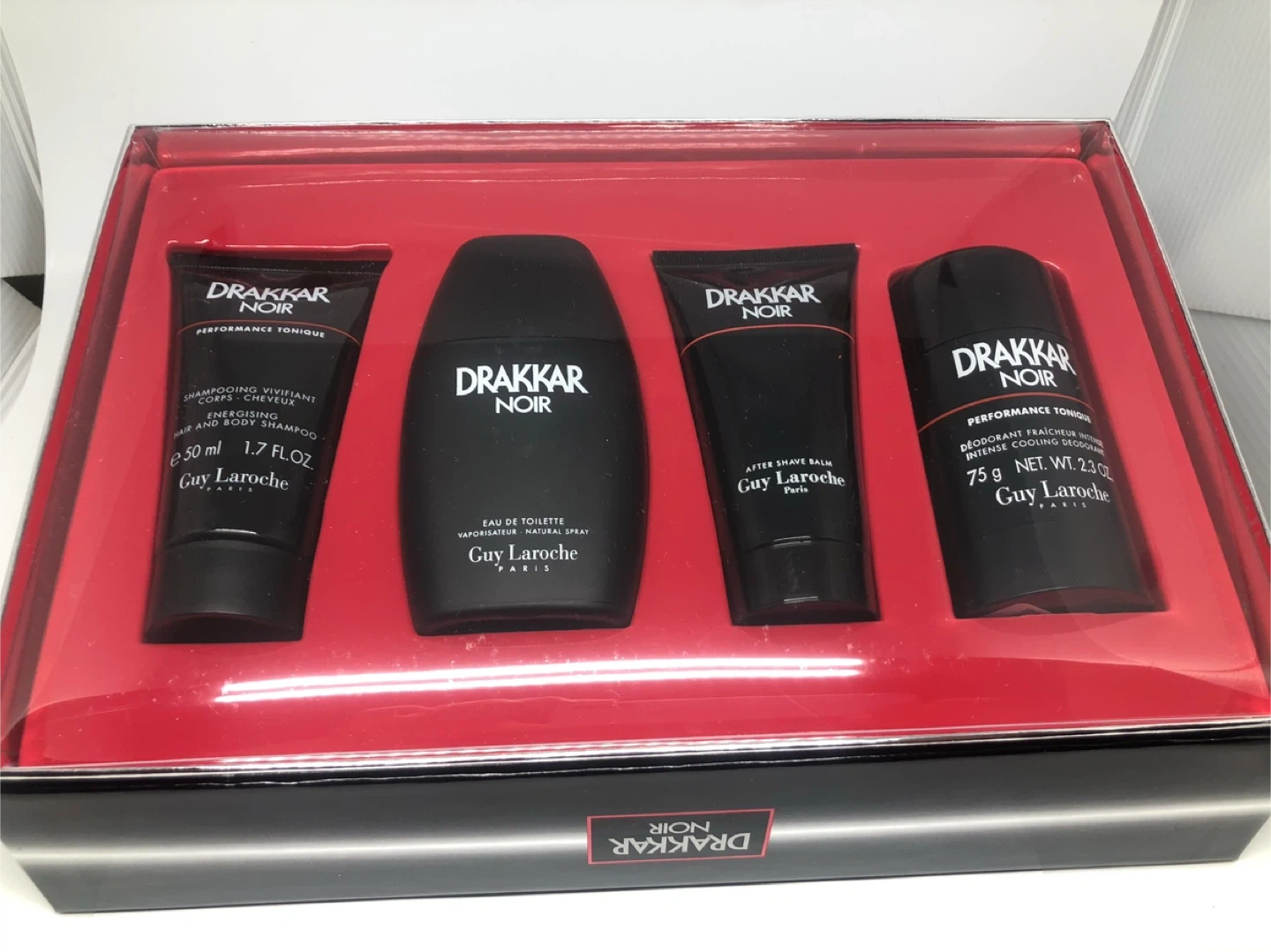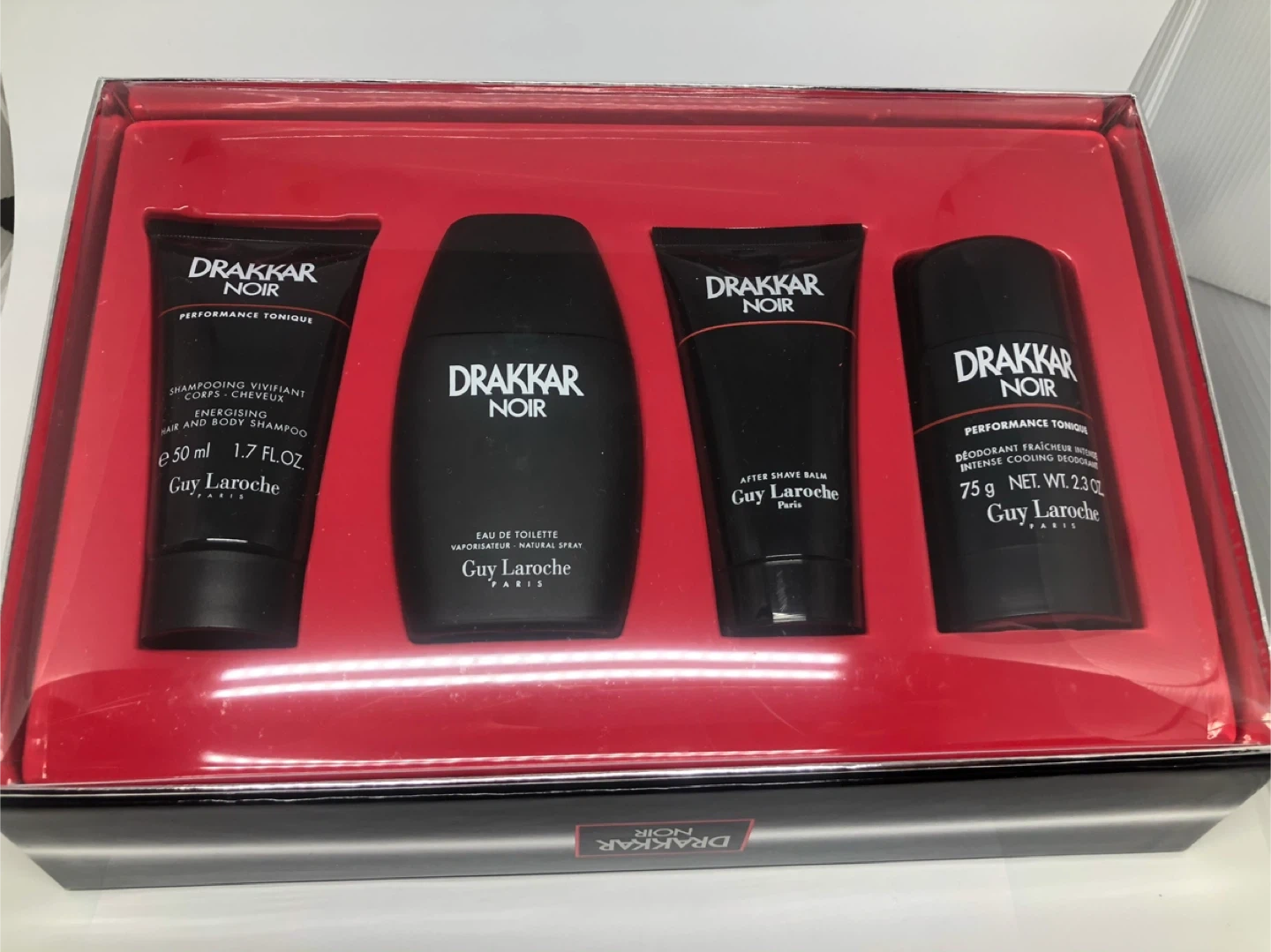 Vintage Drakkar Noir gift set includes Eau de Toilette spray (50ml), After Shave Balm (50ml), Deodorant Stick (75g), and Hair and Body Shampoo (50ml). All products are from the Drakkar Noir line by Guy Laroche. This set is suitable for anyone looking for a complete grooming experience.