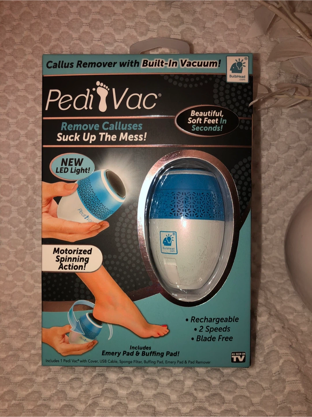 I'm selling a Pedi Vac Callus Remover with Built-In Vacuum! It is in like new condition and comes with everything you need for beautiful, soft feet in seconds. - Includes 1 Pedi Vac with Cover, USB Cable, Sponge Filter, Buffing Pad, Emery Pad & Pad Remover - Rechargeable - 2 Speeds - Blade Free