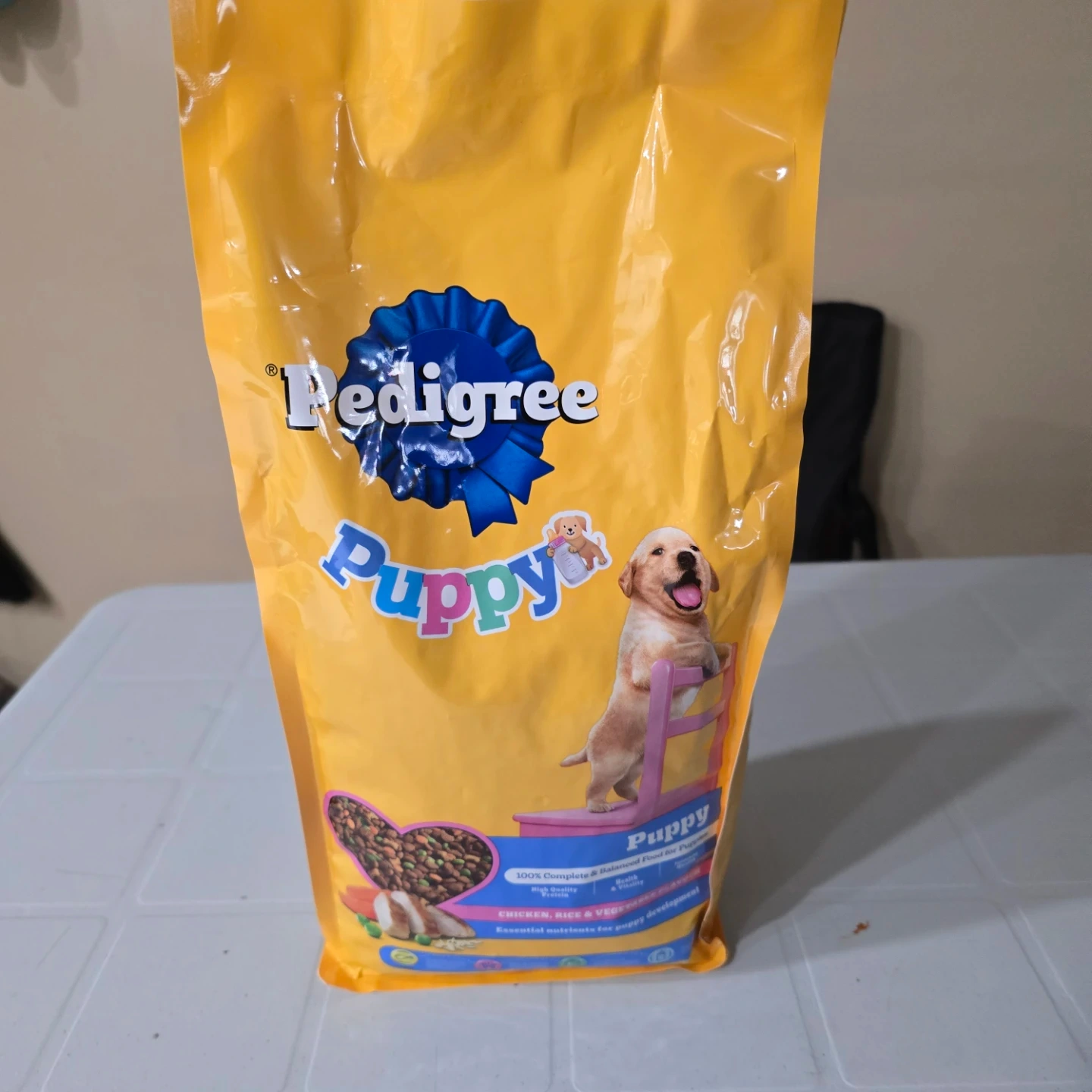 54Selling a bag of Pedigree Puppy food! It's 100% complete and balanced, perfect for your growing pup. Contains chicken, rice, and veggies, providing essential nutrients for puppy development