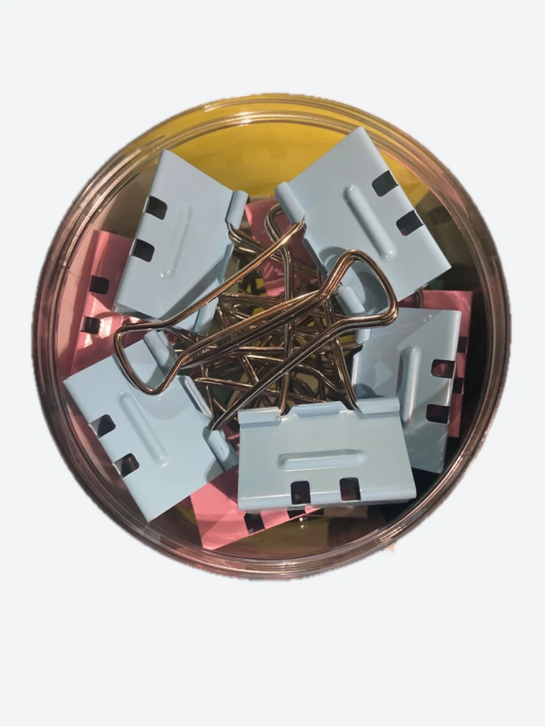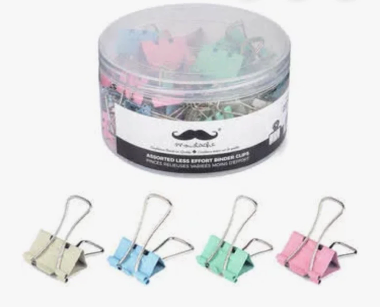 Get organized with these Moustache brand binder clips. They come in a handy container with 20 assorted pastel colours. Features a longer, flatter finger lever and repositions the fulcrum higher up the triangular spring; less effort! They're perfect for keeping papers together at home or in the office!