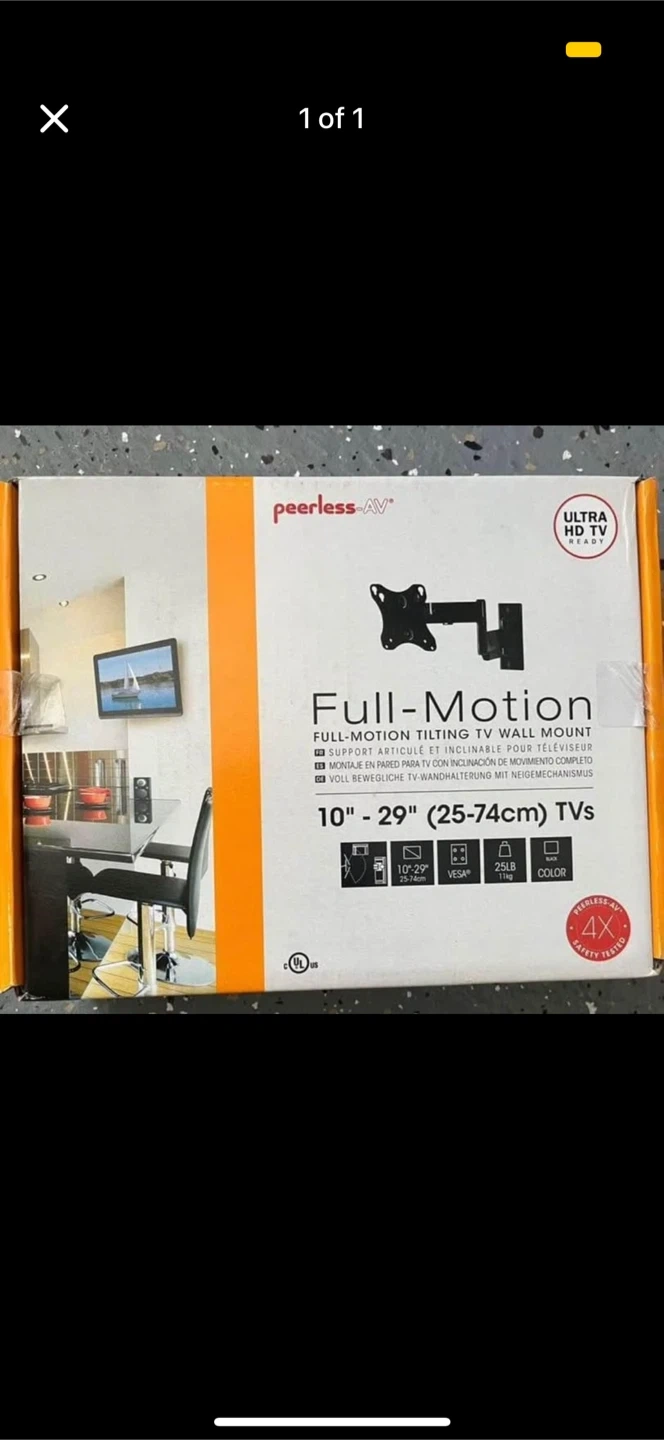 Selling a Peerless-AV full-motion tilting TV wall mount. It's designed for 10"-29" (25-74cm) TVs. The box indicates it supports VESA and can hold up to 25lbs (11kg). It's also been safety tested 4x!