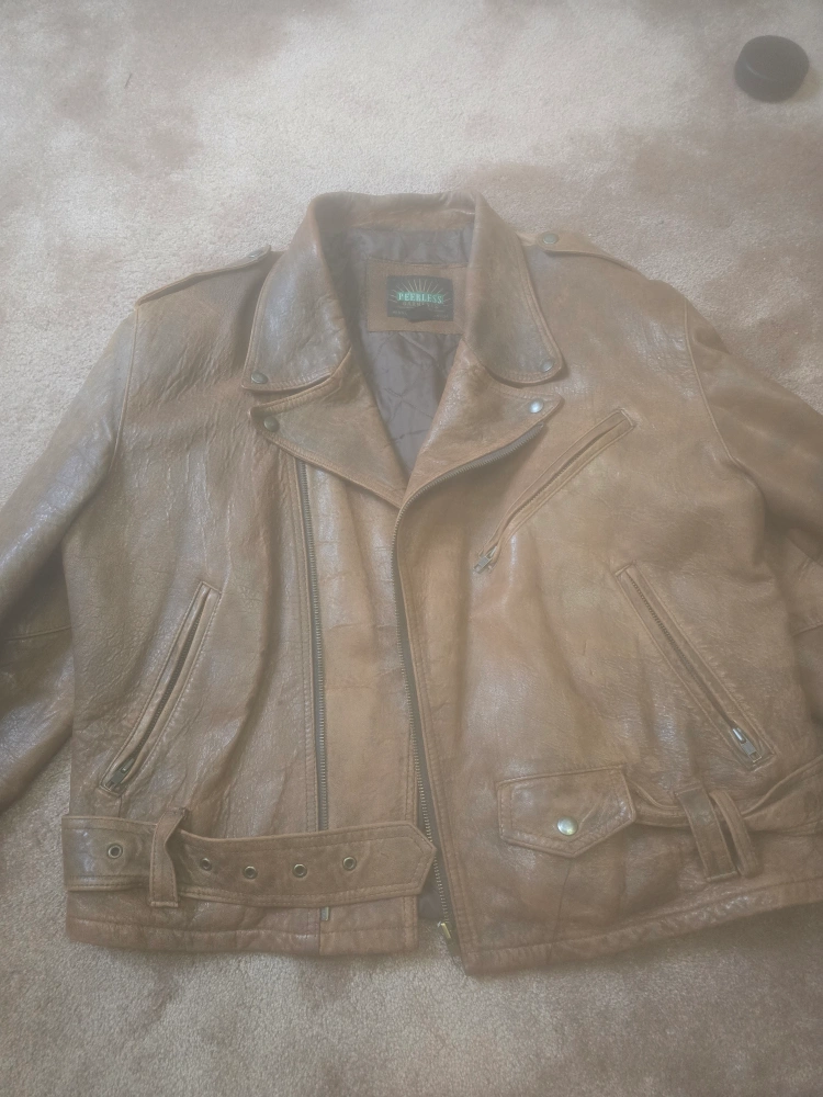 10Selling a Peerless brown leather motorcycle jacket. It is in good condition and ready for a new owner! The jacket has a classic design with multiple pockets and a belted waist.