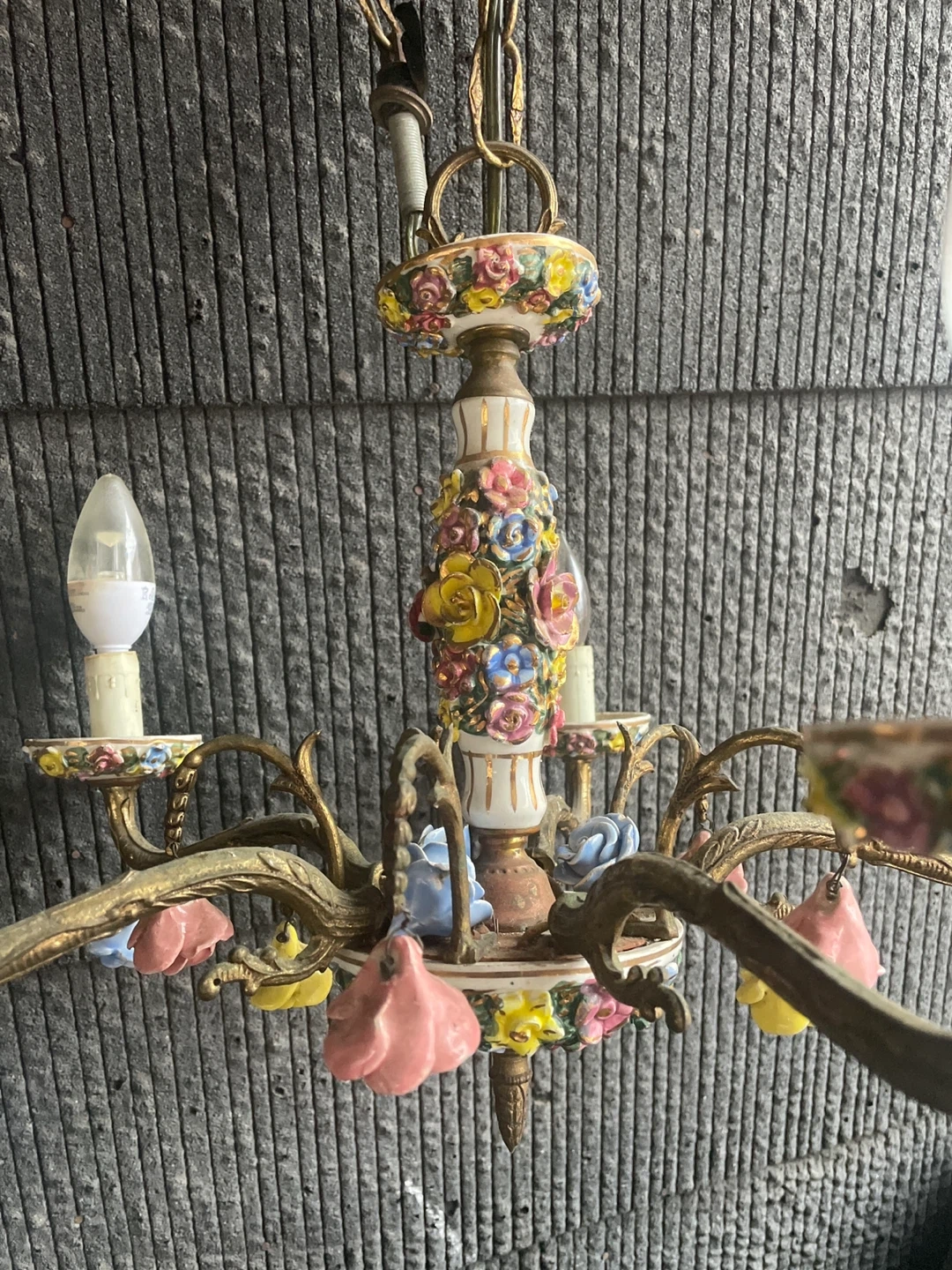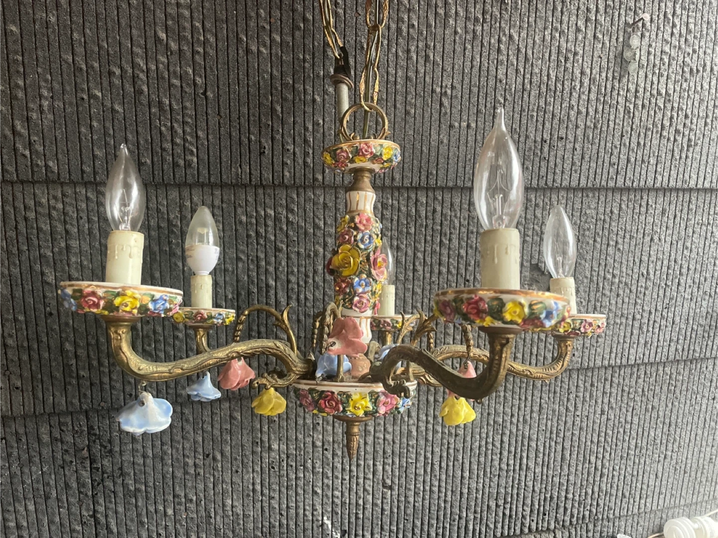 This vintage chandelier features a white ceramic central column adorned with colorful, hand-painted flowers and small decorative ceramic drops. It has a brass-tone metal frame with five arms, each supporting a floral-decorated candle-style light socket.