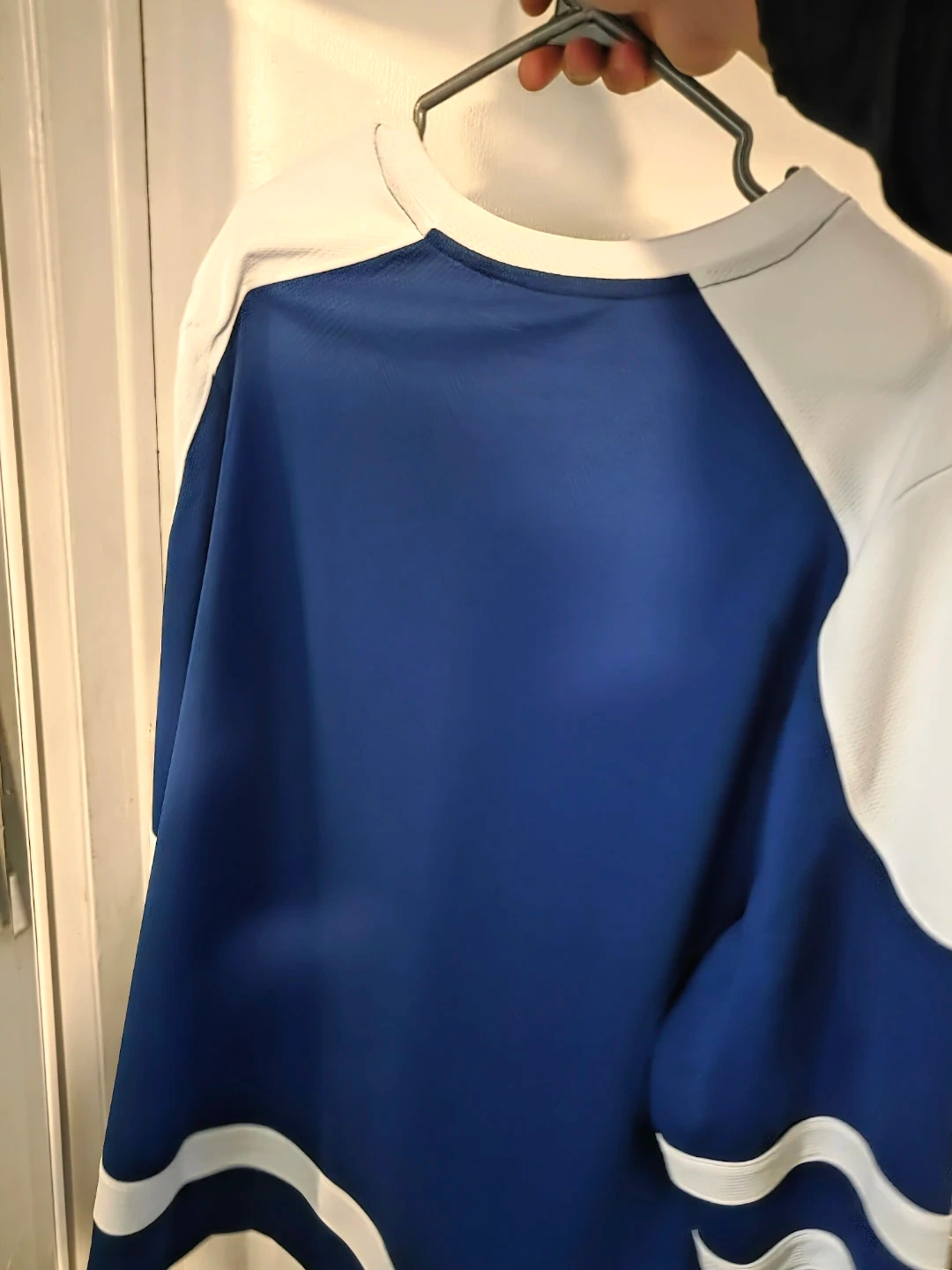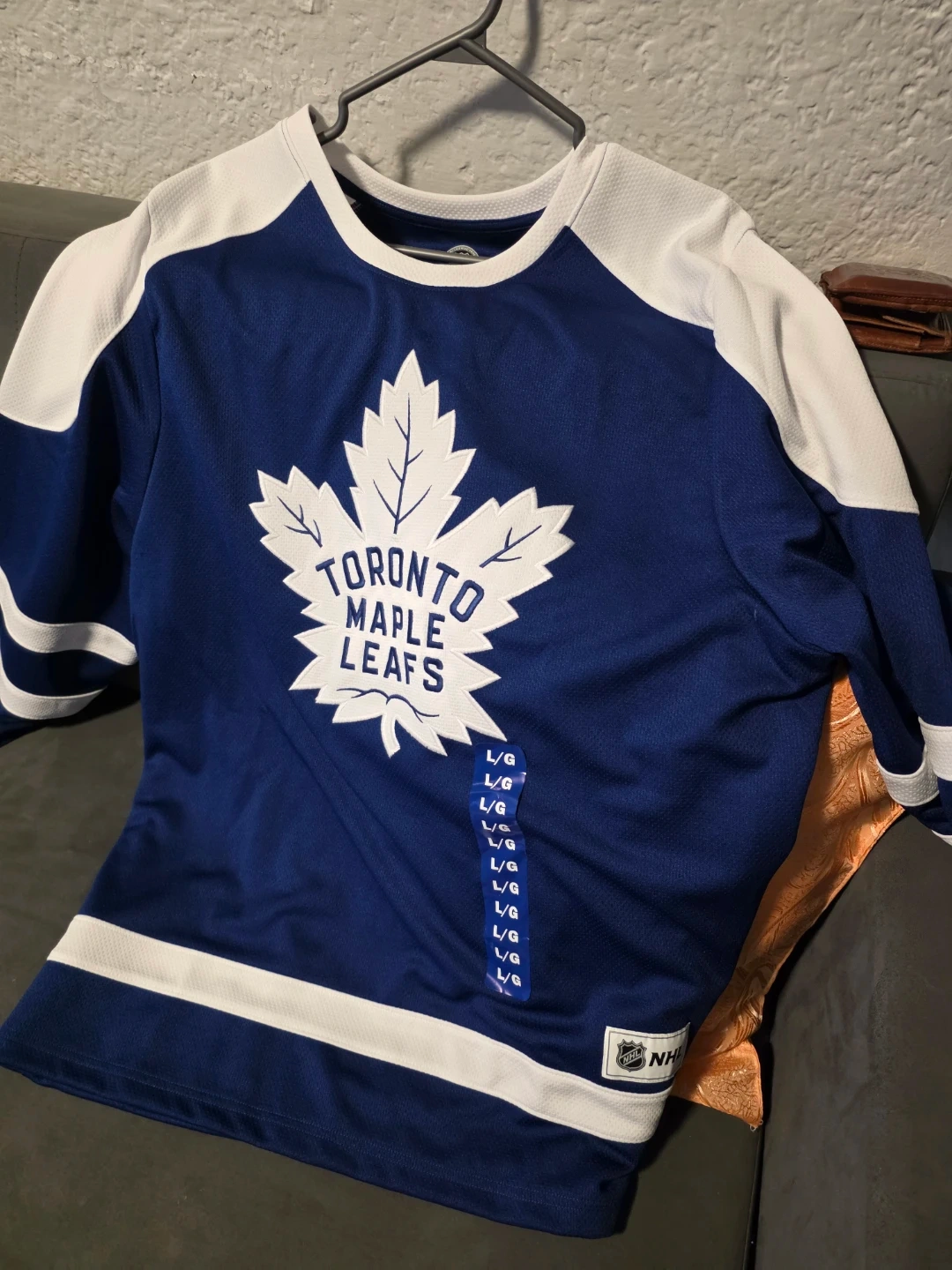 A Toronto Maple Leafs hockey jersey for fans. It's a size L/G and features the team's iconic leaf logo. The jersey is blue with white accents and stripes.