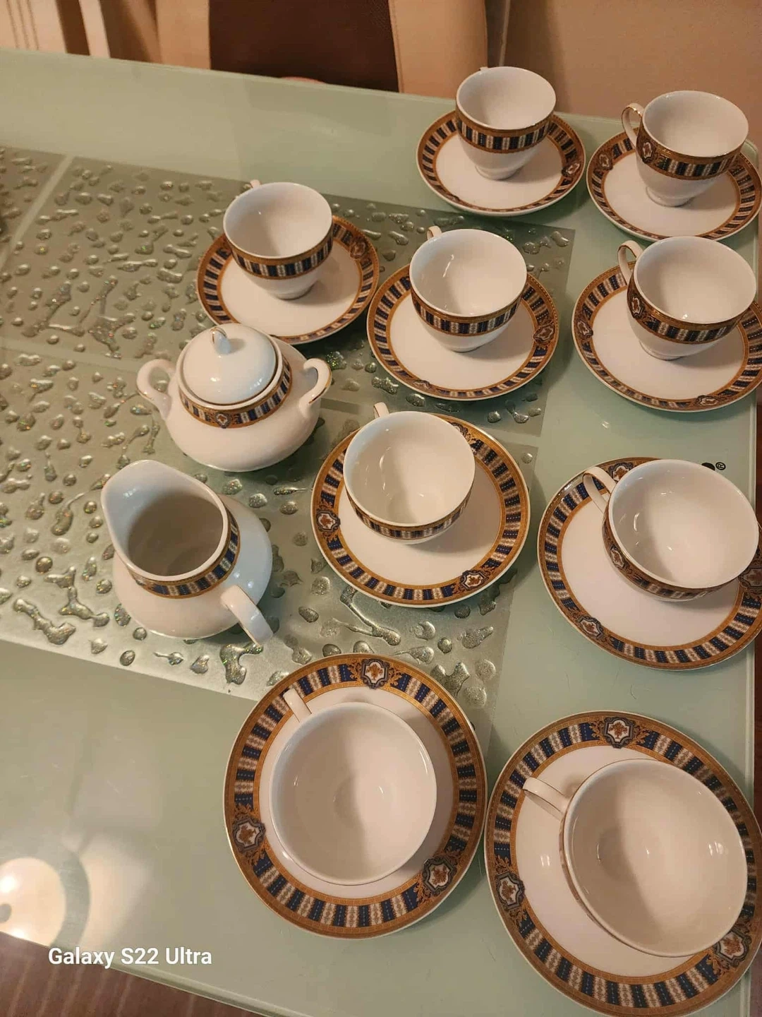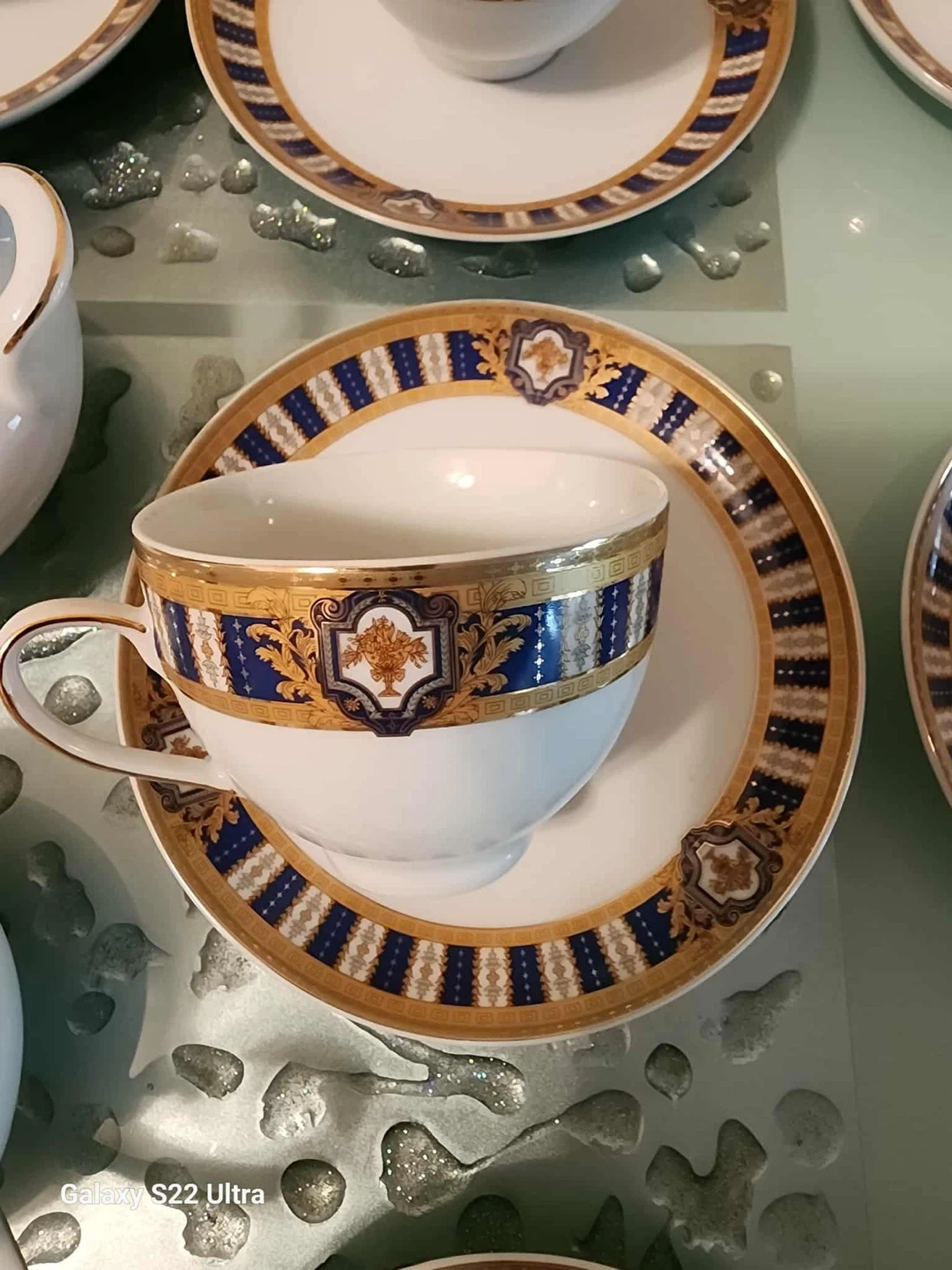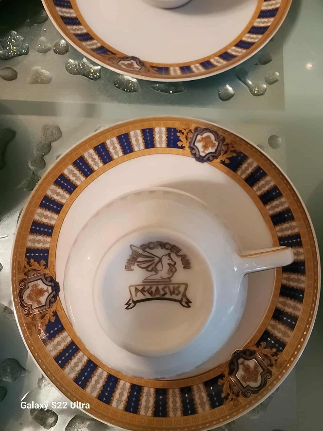 83Selling a beautiful Pegasus fine porcelain tea cup set. The set includes cups, saucers, a sugar bowl, and a creamer. The design features a white base with blue and gold accents. Perfect for tea parties or adding a touch of elegance to your kitchen!
