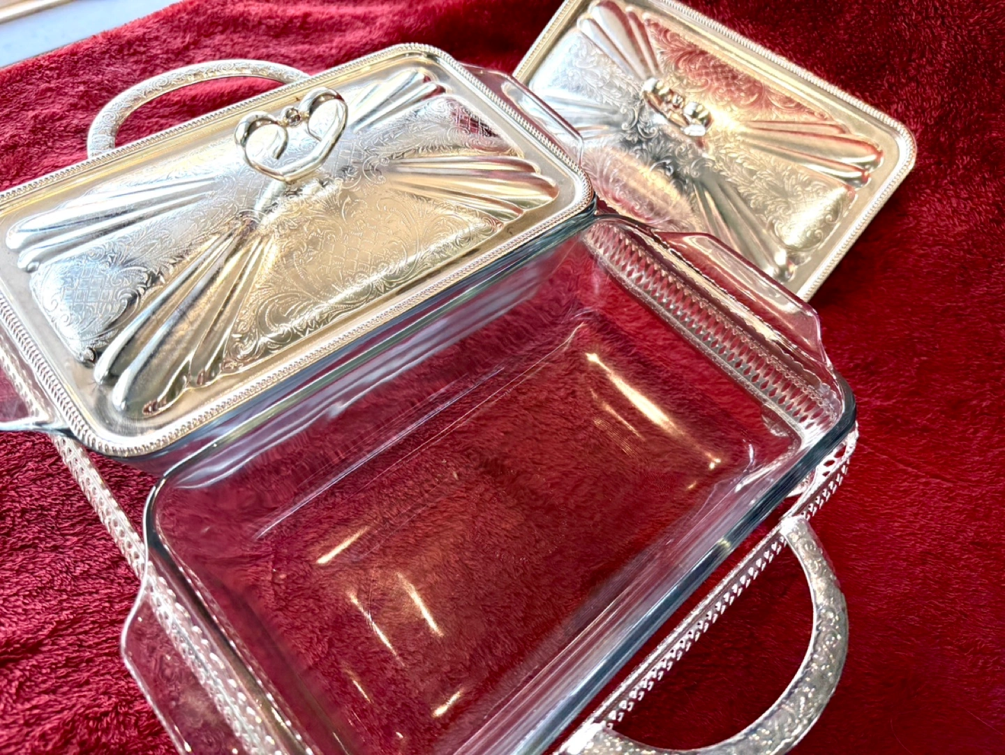 Double glass dishes with two lids. Silver plated. Intricate design. Glass bowls. Shiny silver feet, trim, and handles. Looks brand new