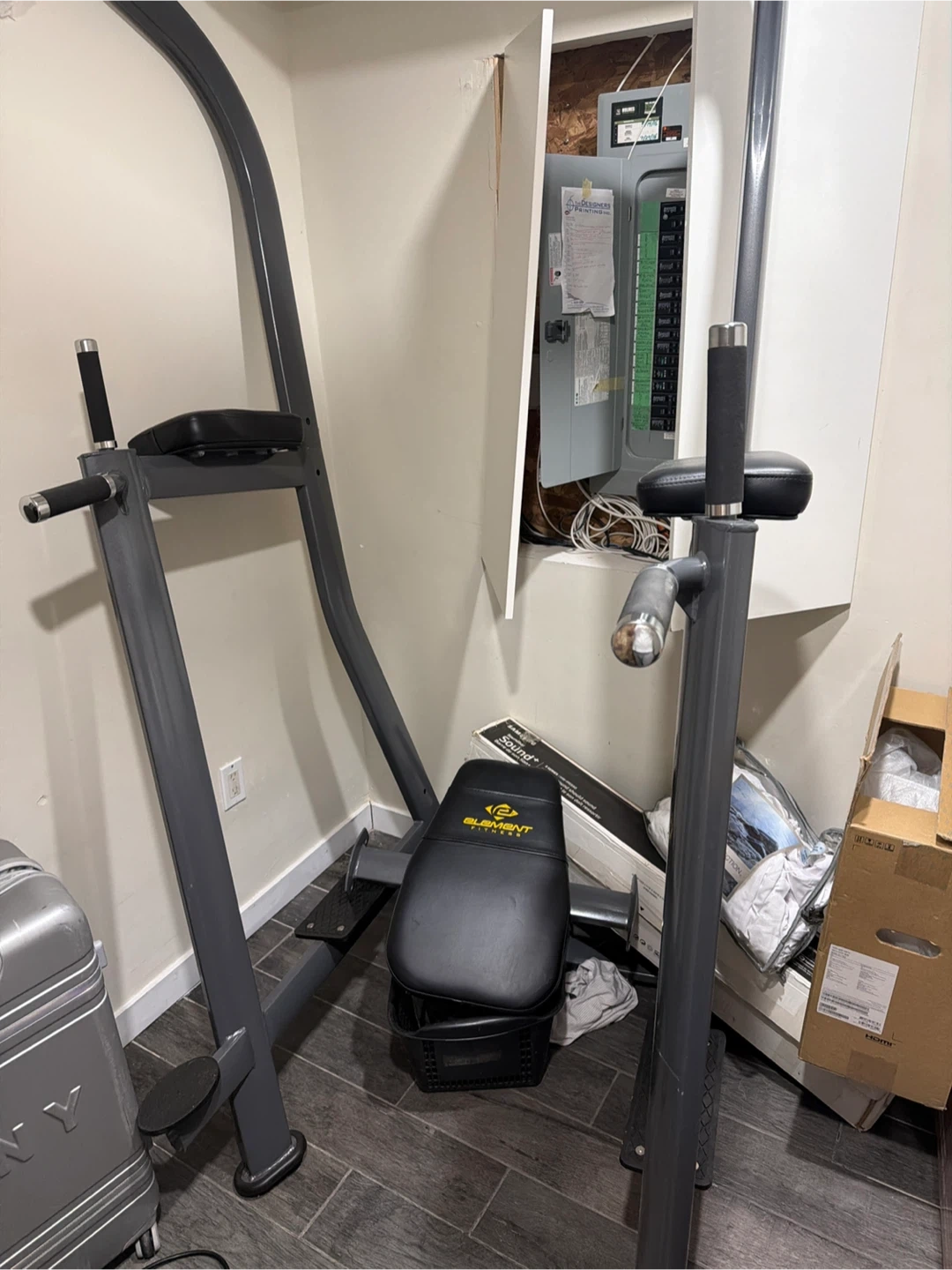 Element Fitness vertical knee raise station for home workouts. It's black with grey metal accents. Includes hardware bag and some replacement parts. Comes with receipt msrp $676.00 from the treadmill factory, barely used.
