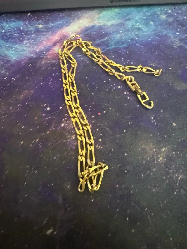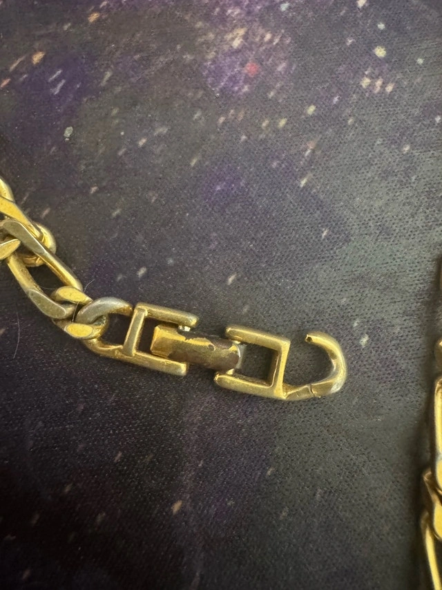 This is a gold chain, but unfortunately the clasp is broken, as can be seen in the photos. Maybe you're good at fixing jewelry, or perhaps you know someone who is! If this ad is still up, you can be sure the chain is available!