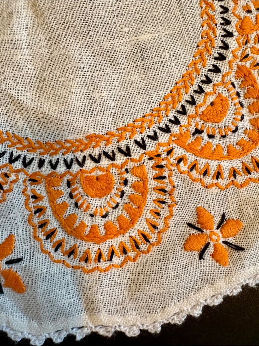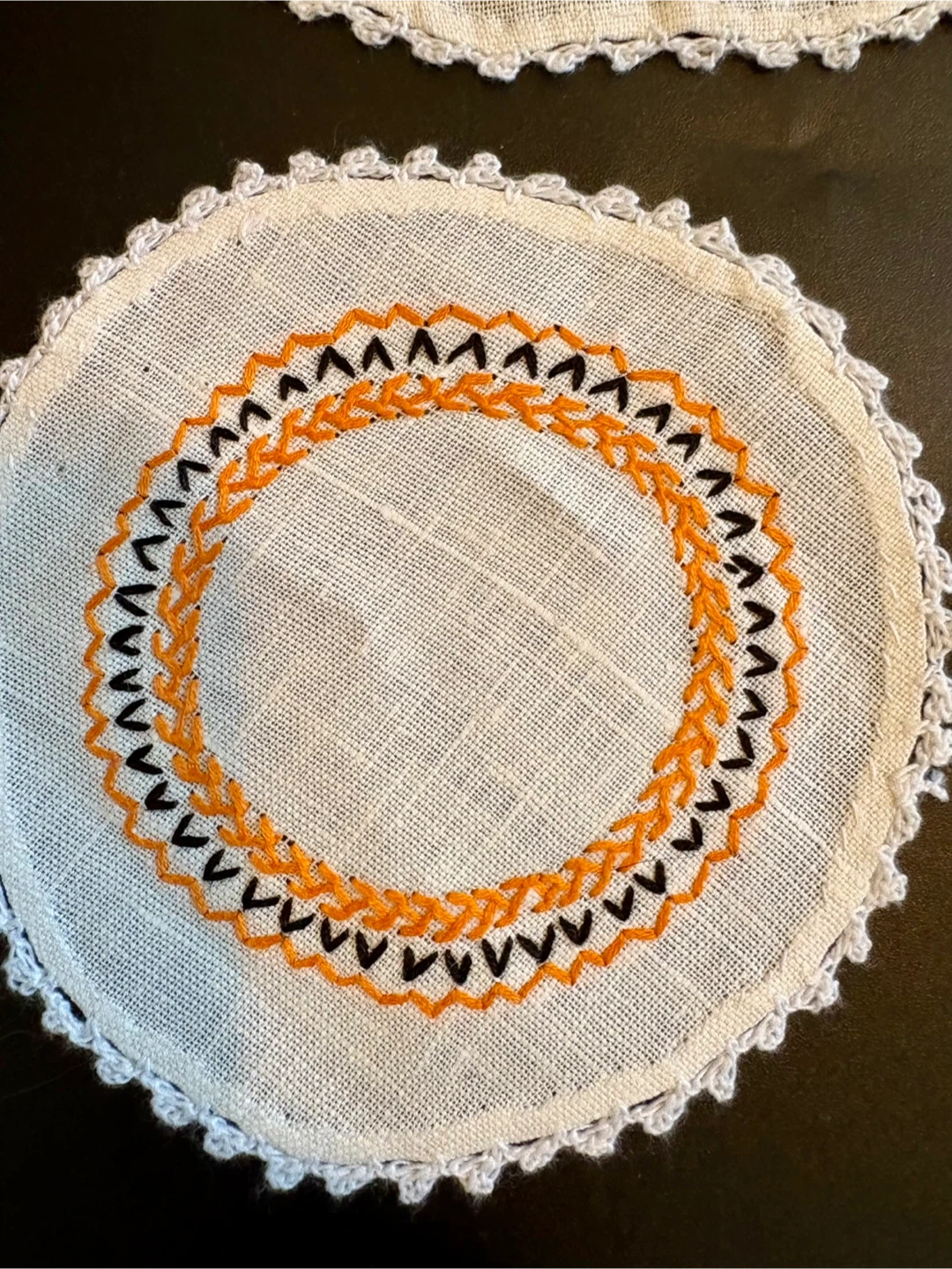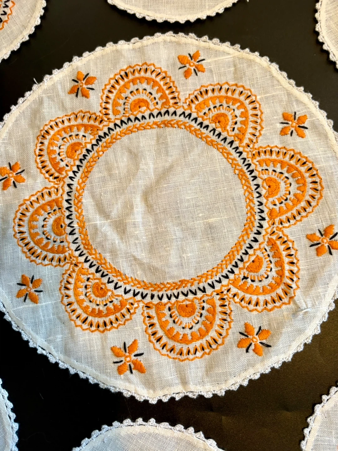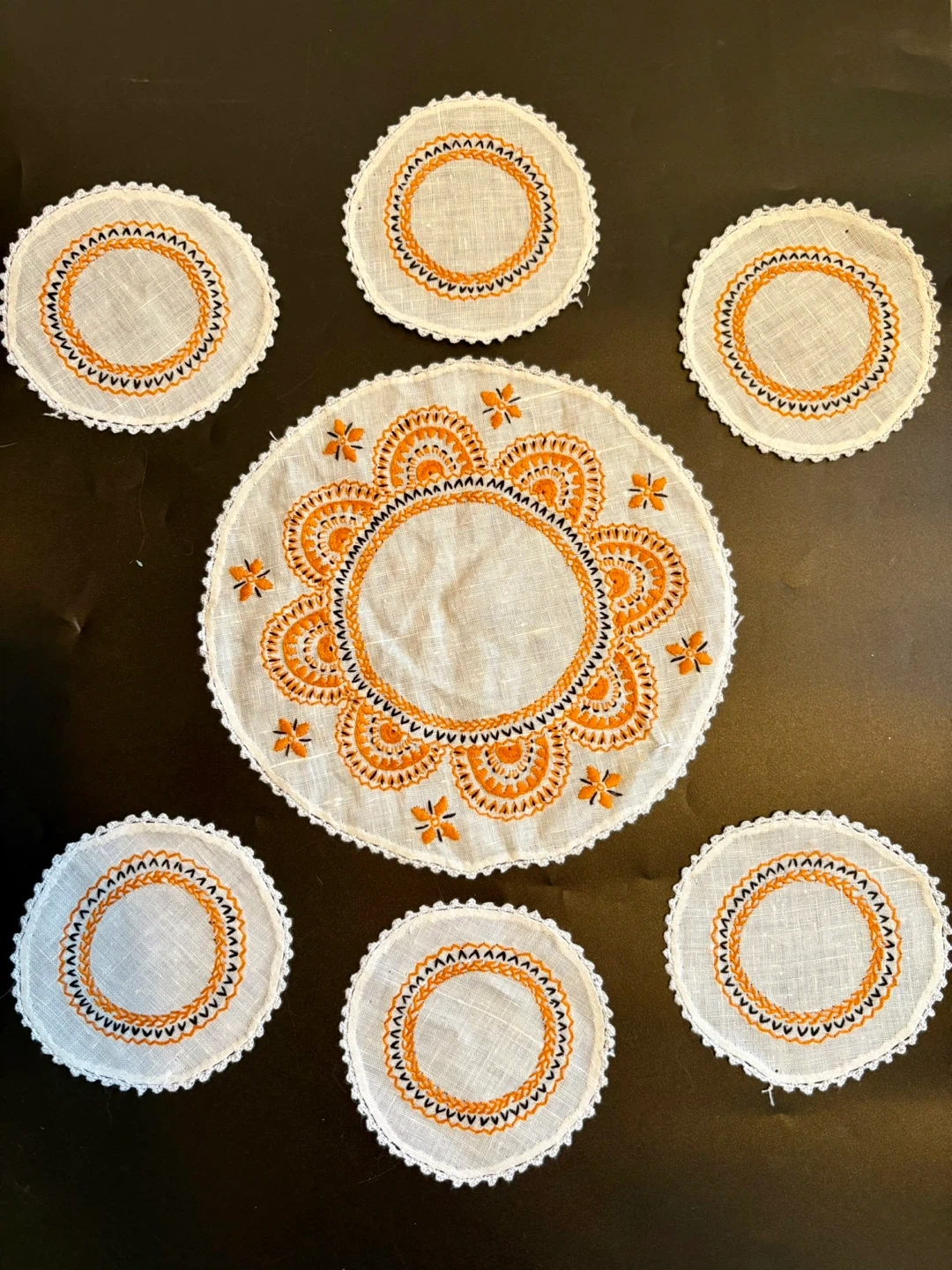 This set includes one circular table runner and six round coasters. All pieces feature white linen-like fabric with orange and black embroidered detailing and a crocheted edge. The runner measures approximately 10.5 inches in diameter. Coasters are about 4 inches in diameter. They're perfect for protecting surfaces from drinks!