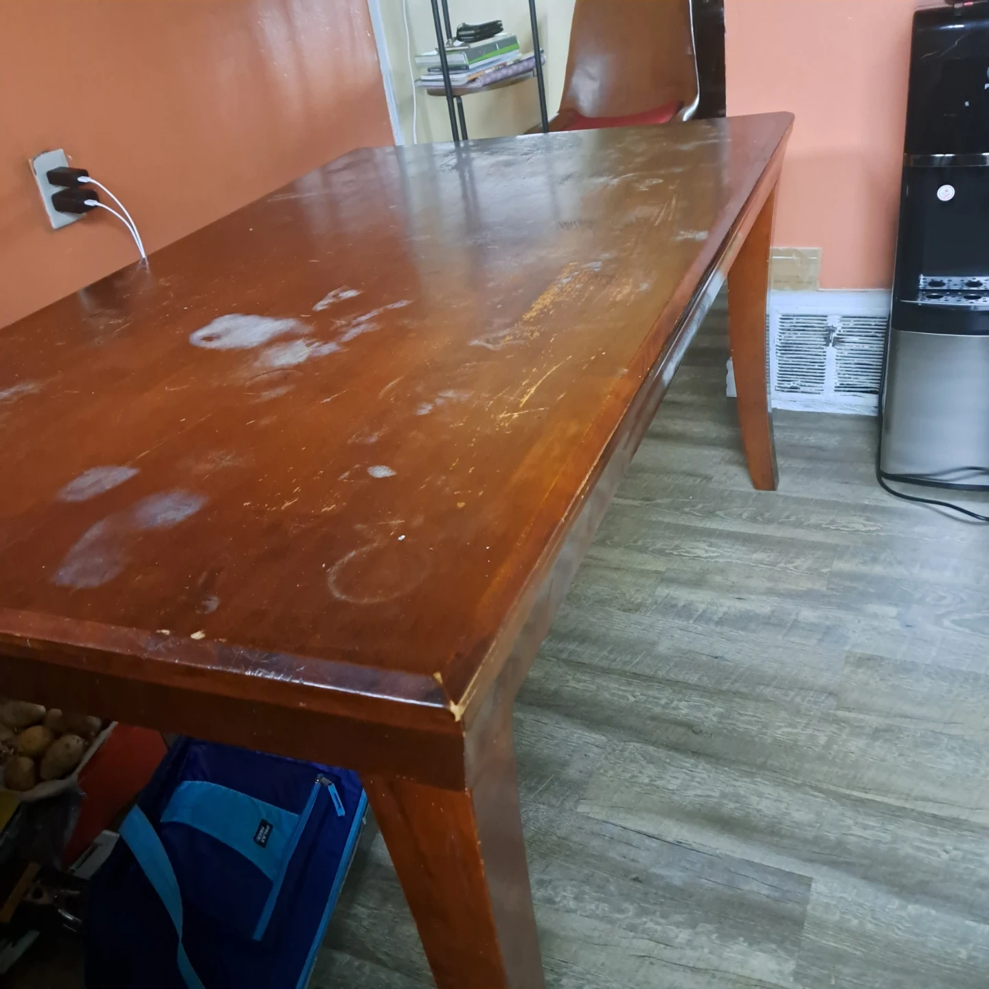A sturdy wooden dining table with a warm brown finish. It has a simple, classic design perfect for family meals. Some surface marks are present. Seats 4-6.