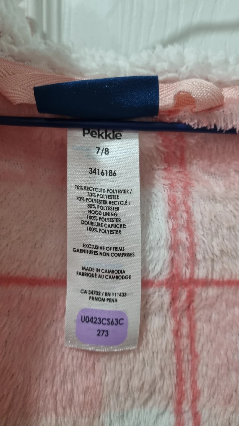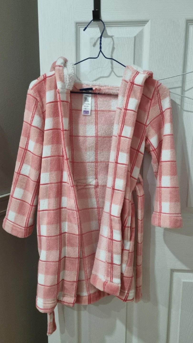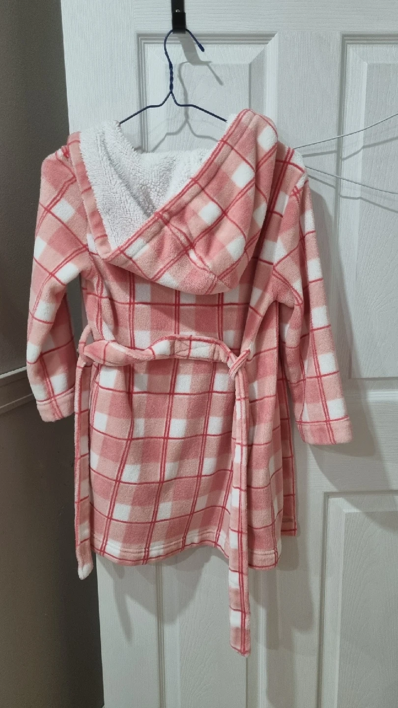 10Cozy up your little one with this adorable Pekkle bath robe! It's a size 7/8 and features a cute pink and white plaid pattern. Made with soft, absorbent material to keep them warm after bath time or a swim. The robe includes a hood and a tie belt, perfect for keeping them snug and secure
