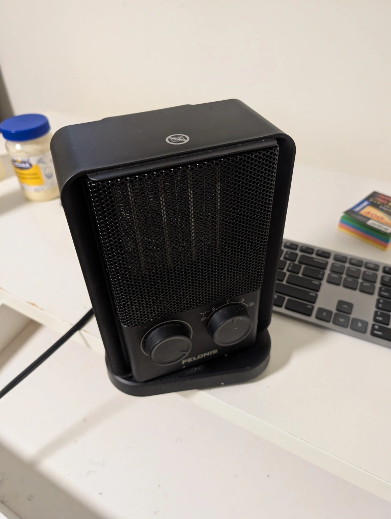 This is a Pelonis portable space heater in black. It's perfect for a small room or office space. It has adjustable settings to control the heat output and is easy to move around