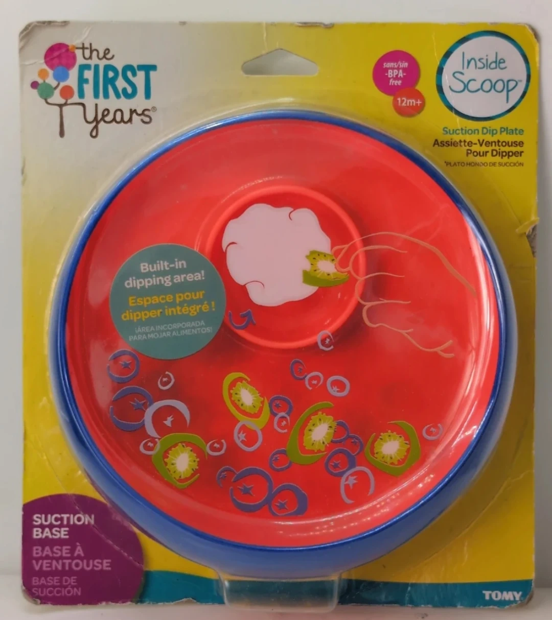 This plate features a built-in dipping area and a removable rim for less mess. It has a suction base to prevent spills and separate sections for food. Perfect for babies 12 months and older!