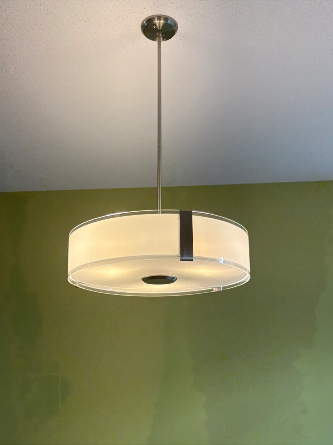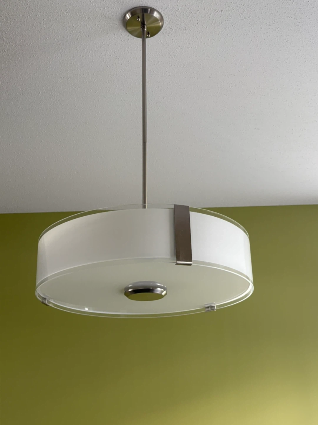 Selling a pendant light fixture that adds a touch of elegance to any room. It features a sleek design with a white shade and brushed nickel accents. Perfect for dining rooms, living rooms, or entryways. It's in great condition and ready to brighten up your home