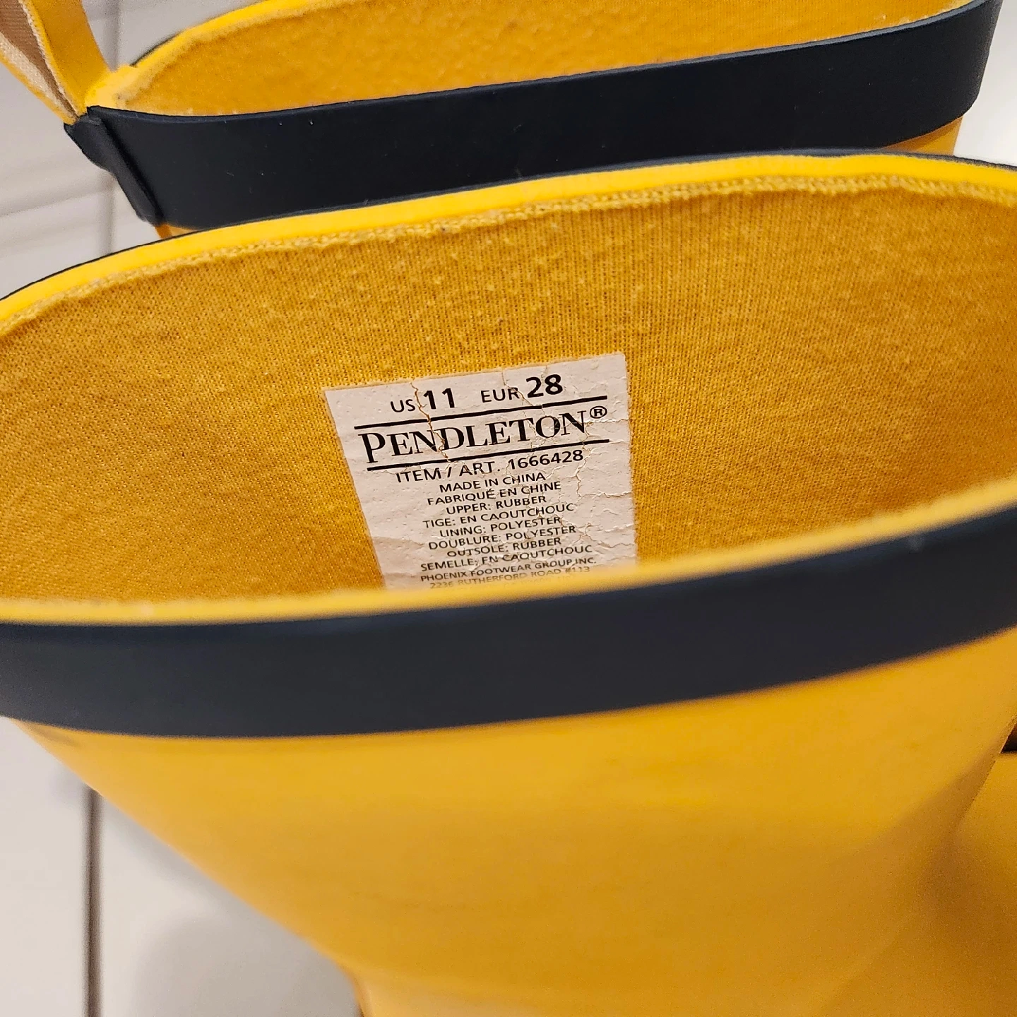 These are a pair of bright yellow rain boots from Pendleton! They're in great shape and ready to keep little feet dry. Paid $30. only worn once! - Brand: Pendleton - Size: US 11 / EUR 28 - Material: Upper is rubber, lining is polyester