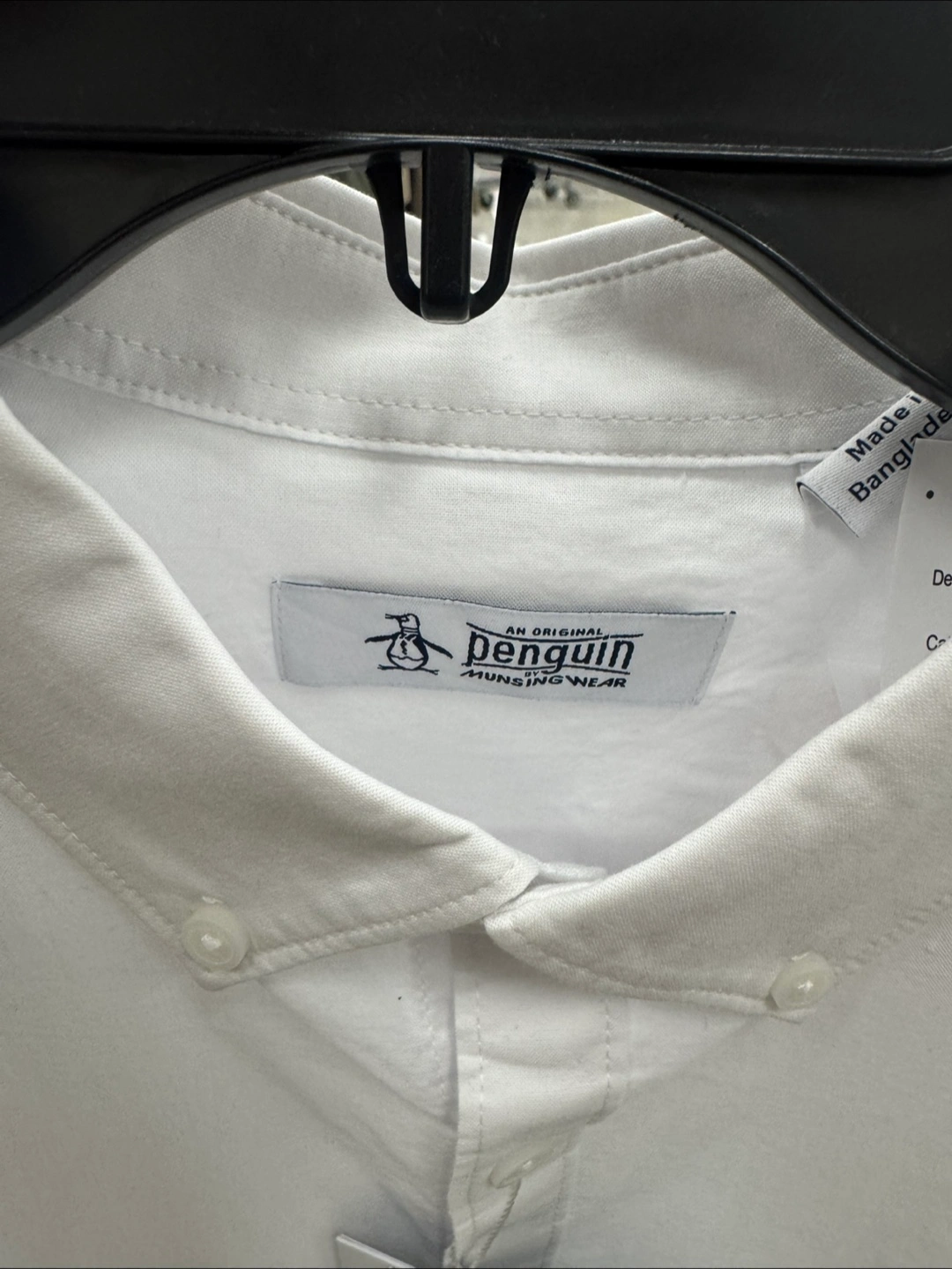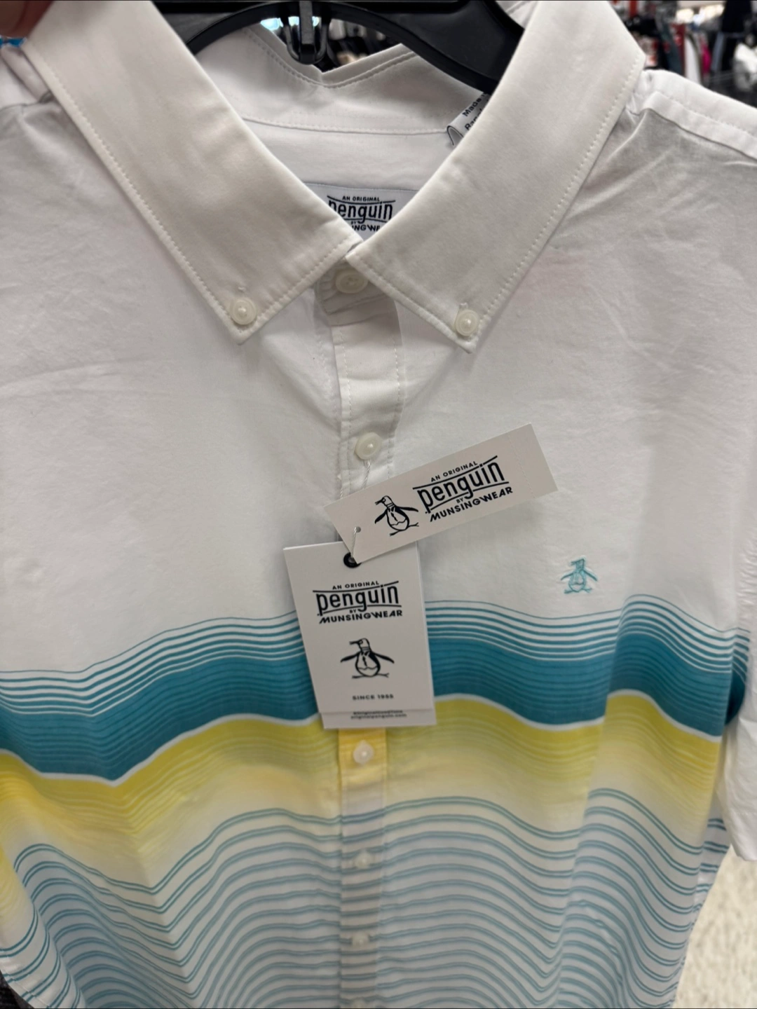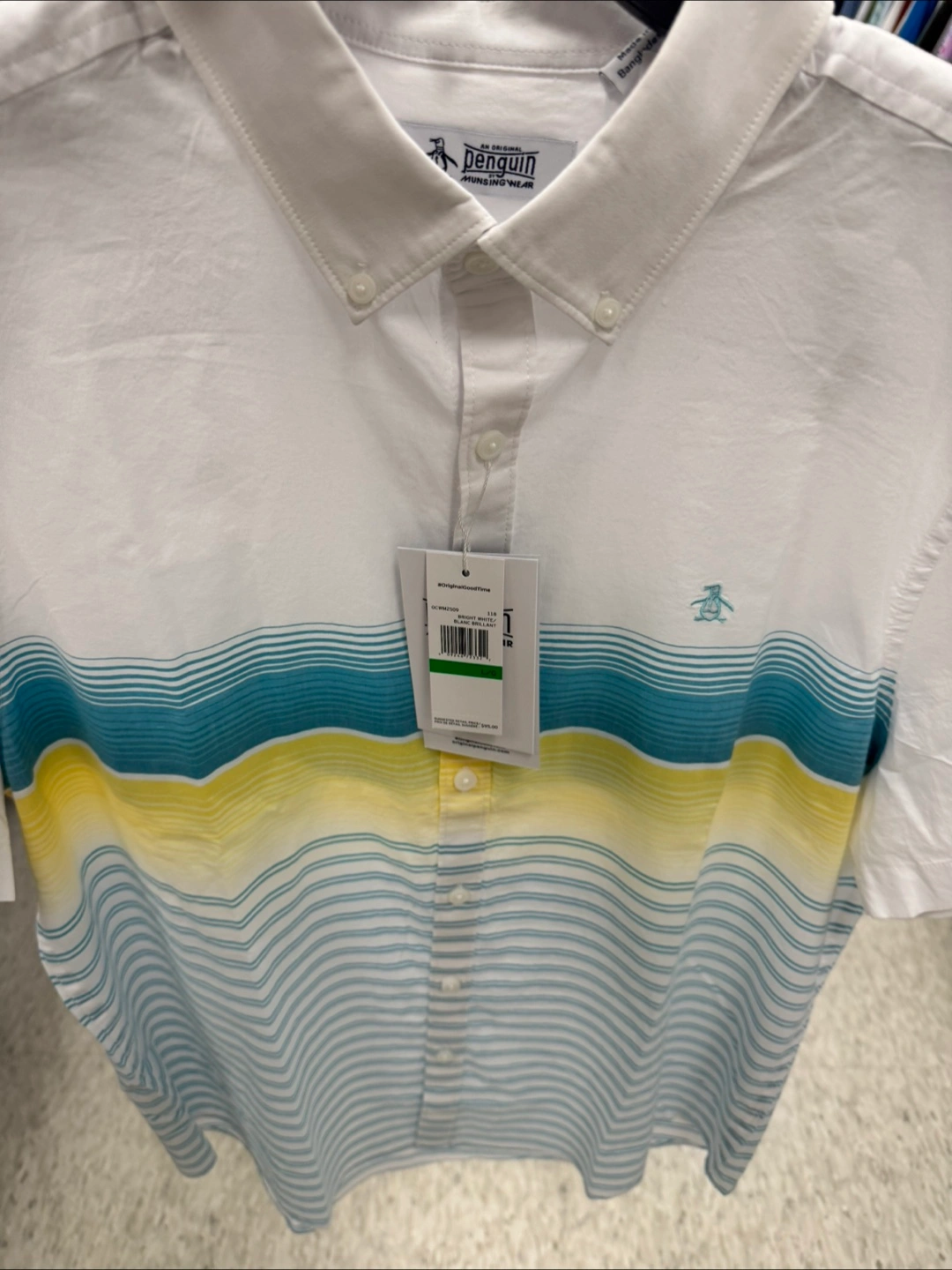 Here's a stylish Penguin Munsingwear shirt! It features a unique design with horizontal stripes in shades of blue and yellow on a crisp white background. Perfect for adding a touch of flair to your wardrobe Size Large