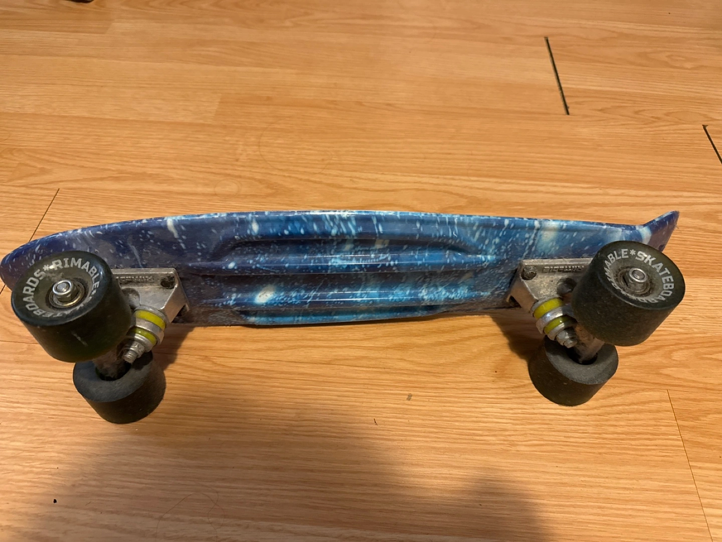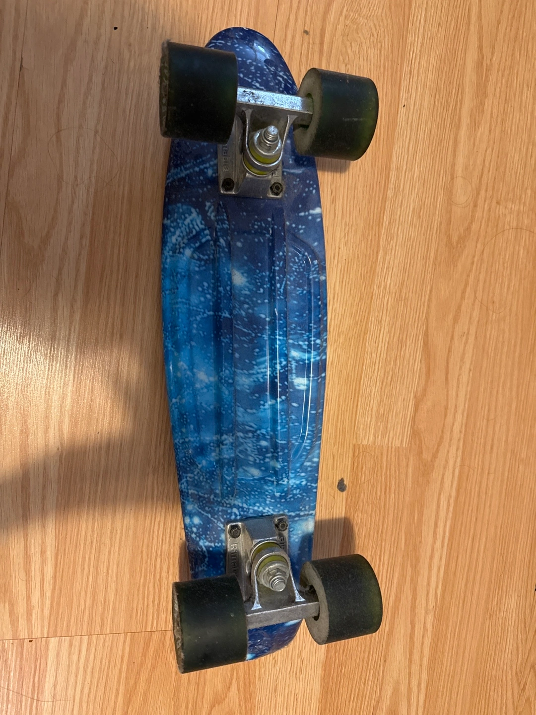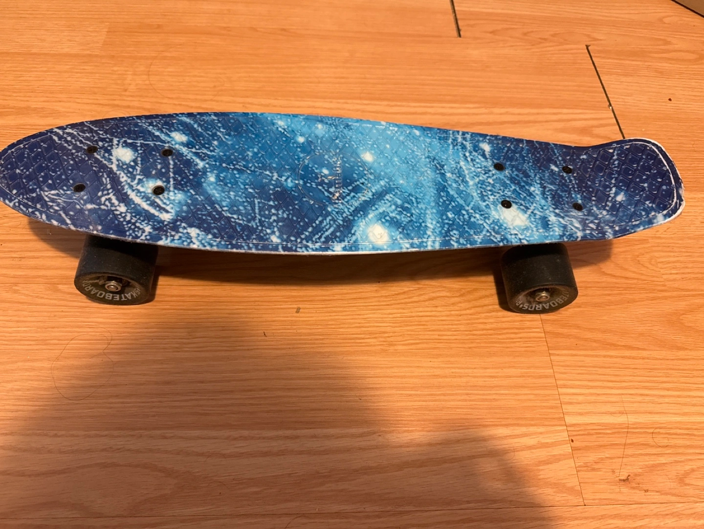 25Moving out SALE Blue and white skateboard with black wheels.
