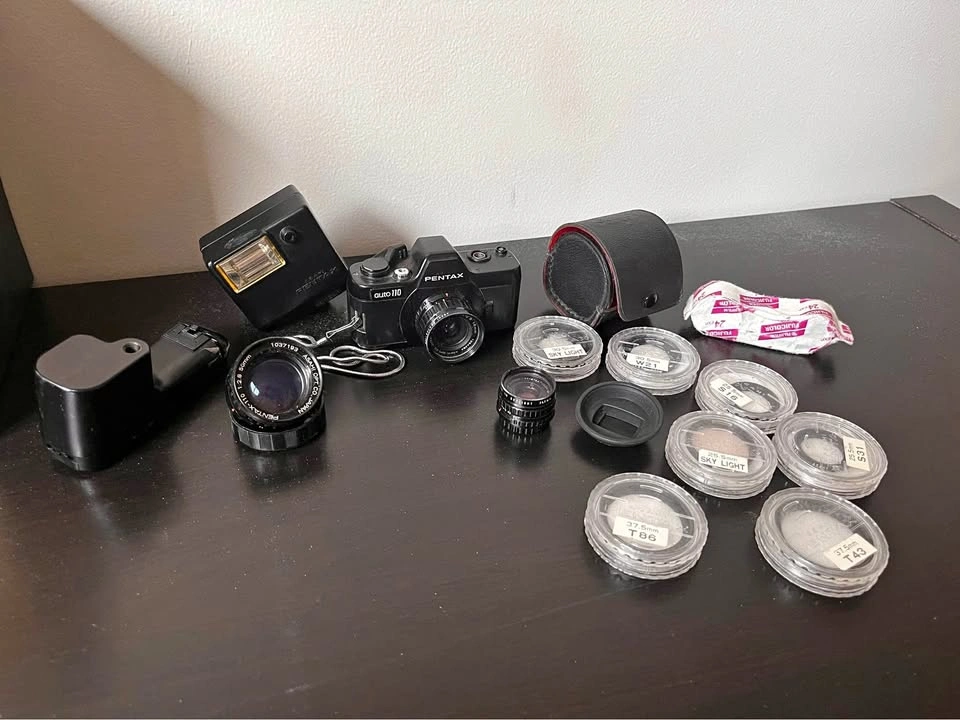 88Selling a used Pentax Auto 110 camera, a compact vintage film camera system, complete with a flash, multiple lenses, caps, and original packaging. This Pentax Auto 110 is perfect for film photography enthusiasts interested in a unique and portable system. It should be working, but due to the 110 film, I’ve never used it.