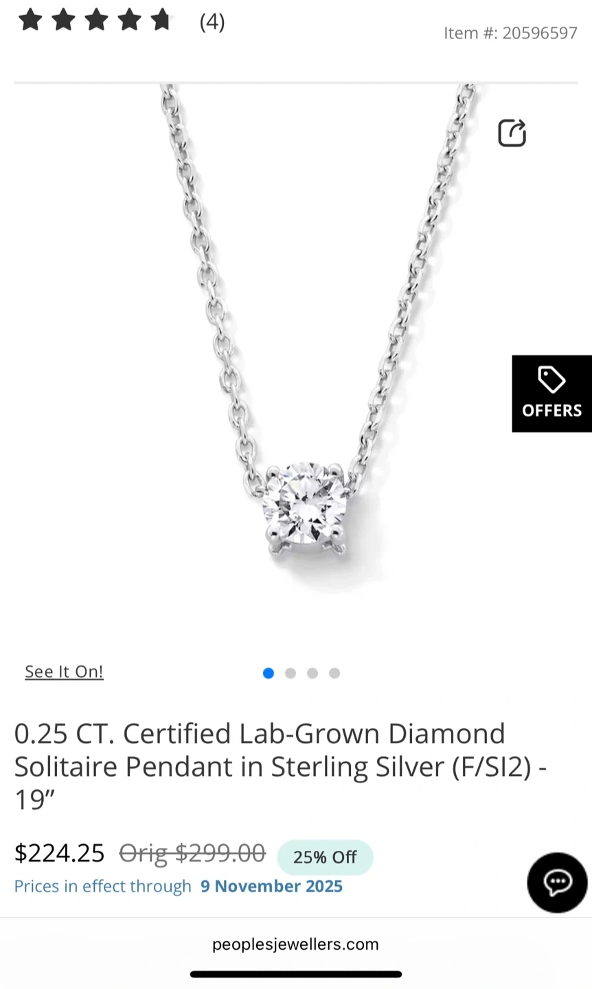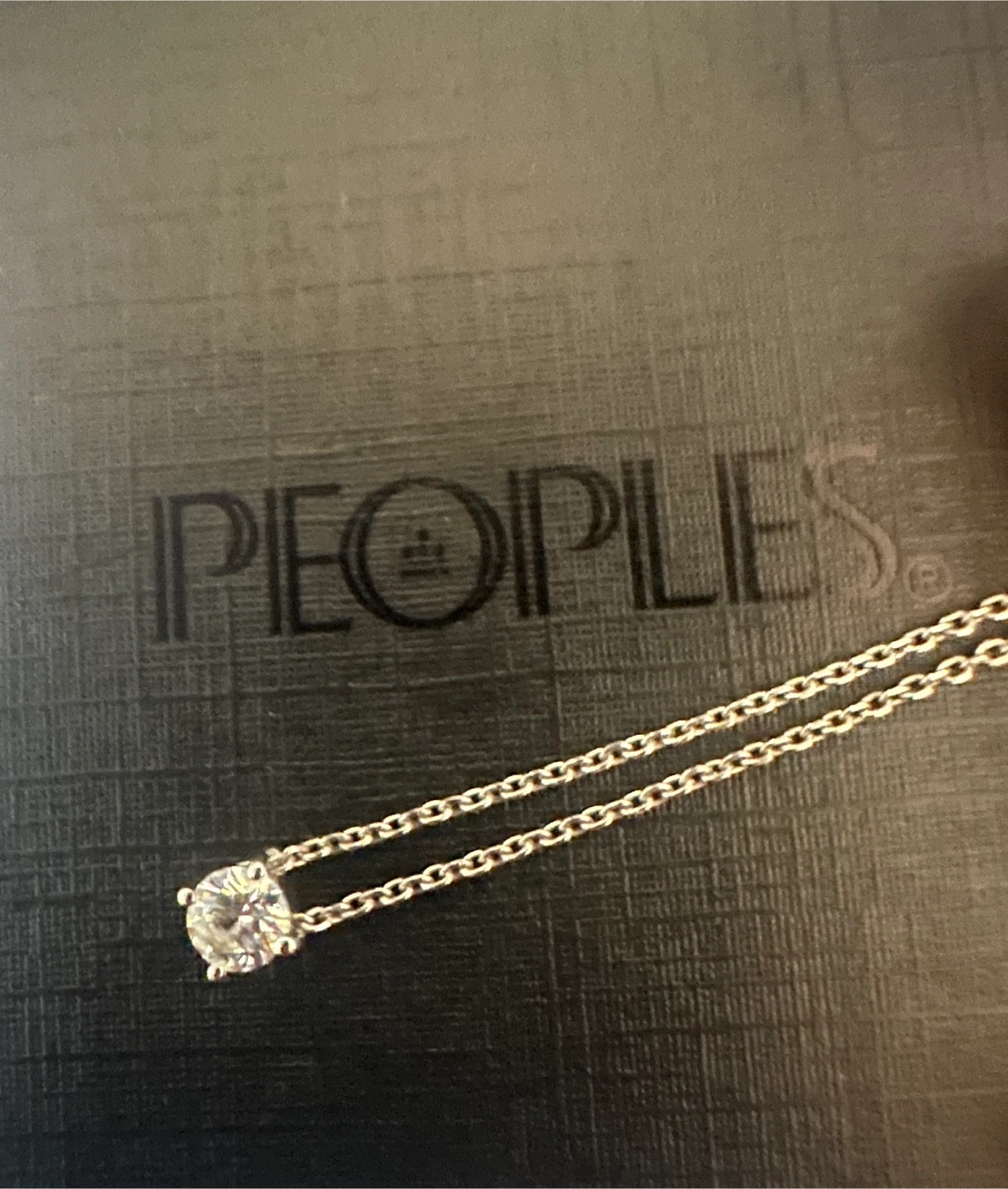60Selling a beautiful diamond solitaire pendant from Peoples Jewellers! It's a 0.25 CT. certified lab-grown diamond in sterling silver (F/SI2) with a 19" chain. Originally bought for $299.00.