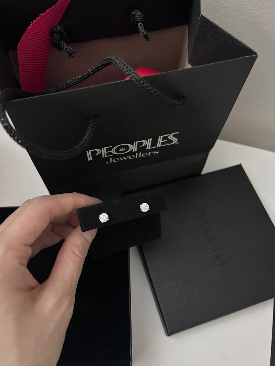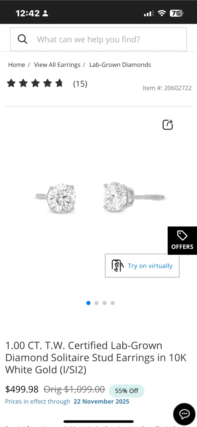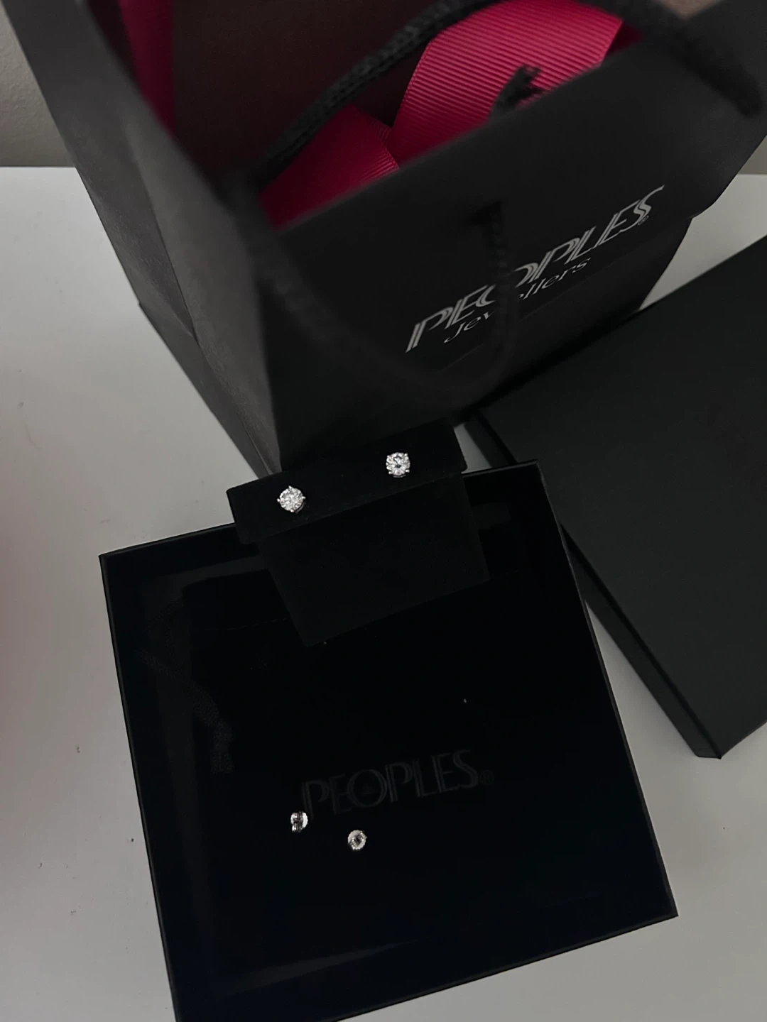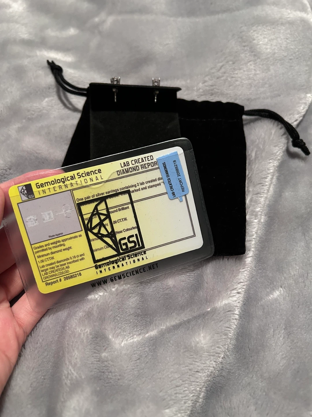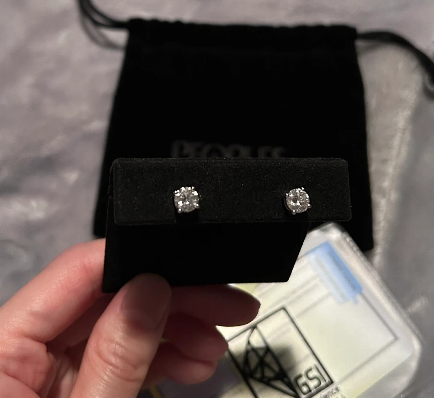 65Selling a pair of lab-created diamond stud earrings from Peoples Jewellers! The earrings are silver and contain two lab-created diamonds, each 0.09 c.t.t.w. They come with the original box and a GSI (Gemological Science International) certificate