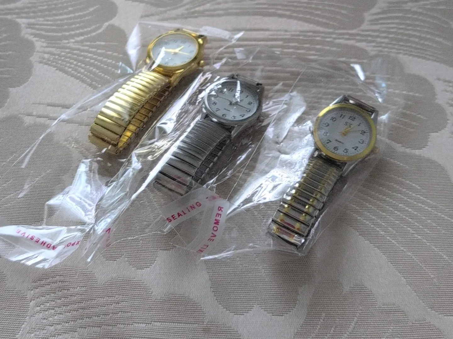 Lot of three ladies' quartz watches. One gold-tone watch and two silver-tone watches. Metal expansion bands. All watches are sealed.
