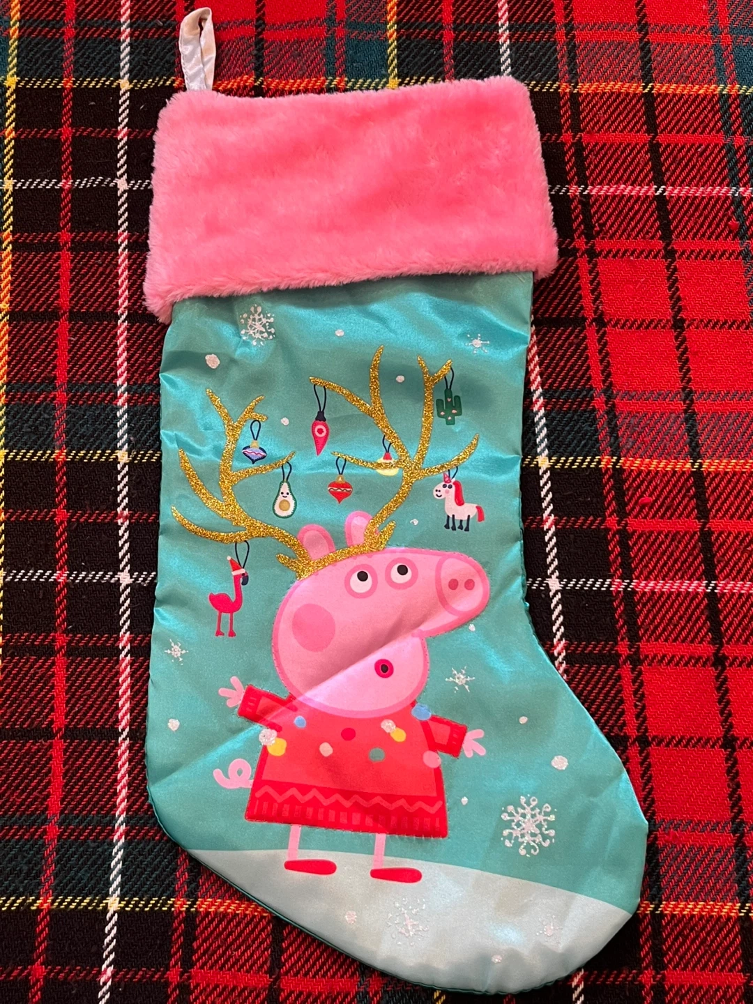 89Get ready for the holidays with this adorable Peppa Pig Christmas stocking! It features a fun design with Peppa dressed in a festive outfit, complete with reindeer antlers and cute hanging ornaments. Perfect for adding a touch of whimsy to your holiday decor. Pickup only, near Oakland’s elementary school