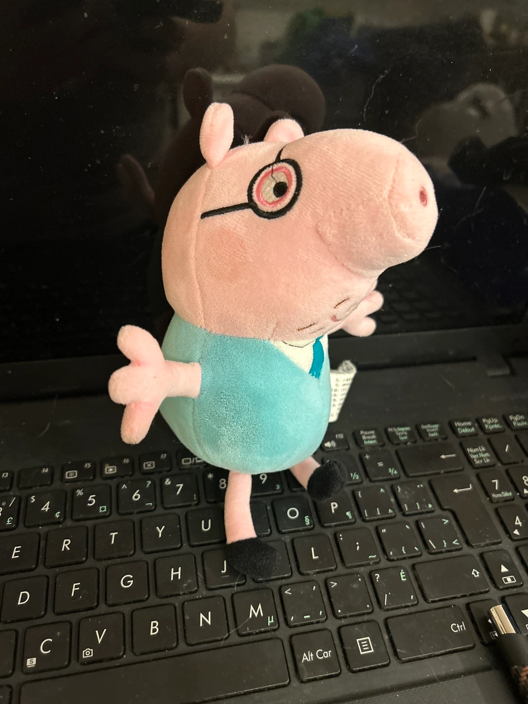 745Small plush toy of Daddy Pig from Peppa Pig. He is wearing his blue shirt and glasses. He is in good condition.