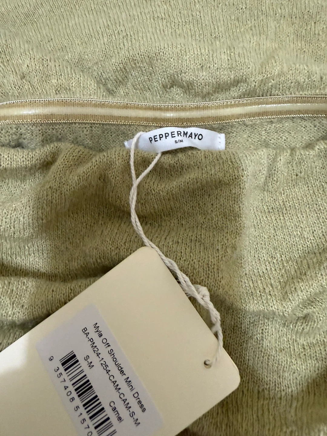 This is a brand new PepperMayo Myia Off Shoulder Mini Dress! It's a size S/M in a lovely camel colour. The dress is made of a comfortable material and perfect for a night out or a special occasion! Comes with original tag.