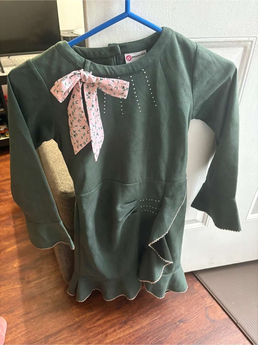 65Cute green dress from Peppermint! It features a sweet pink floral bow and ruffle details. Perfect for a special occasion or just looking adorable