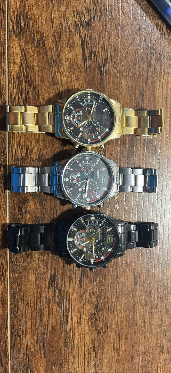 Three men's wristwatches are available. One is gold-toned, one is silver-toned, and the third is black. All feature metal bands and chronograph-style faces.