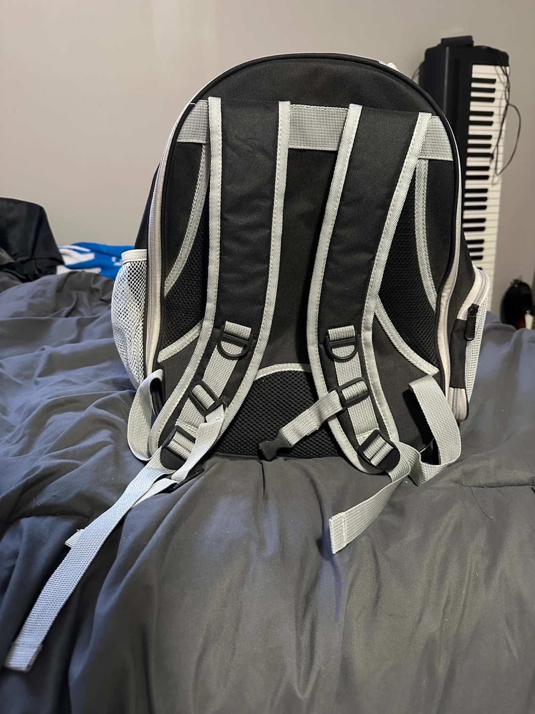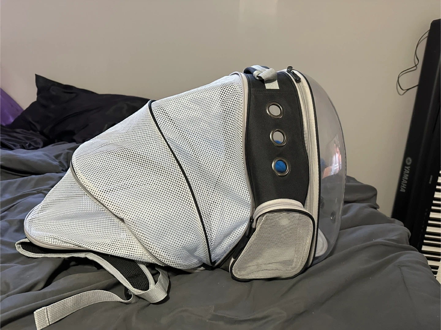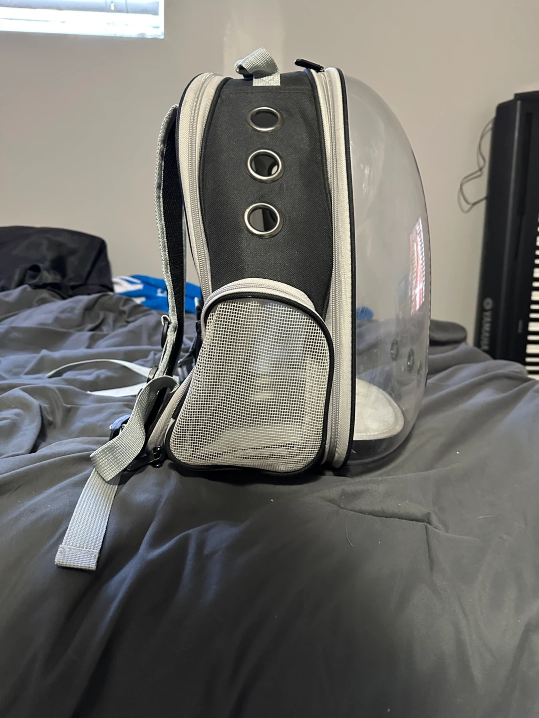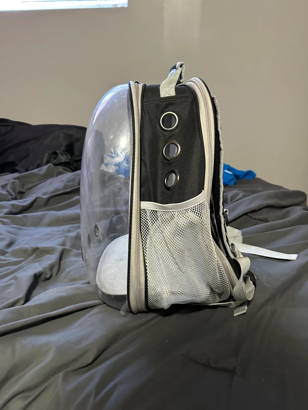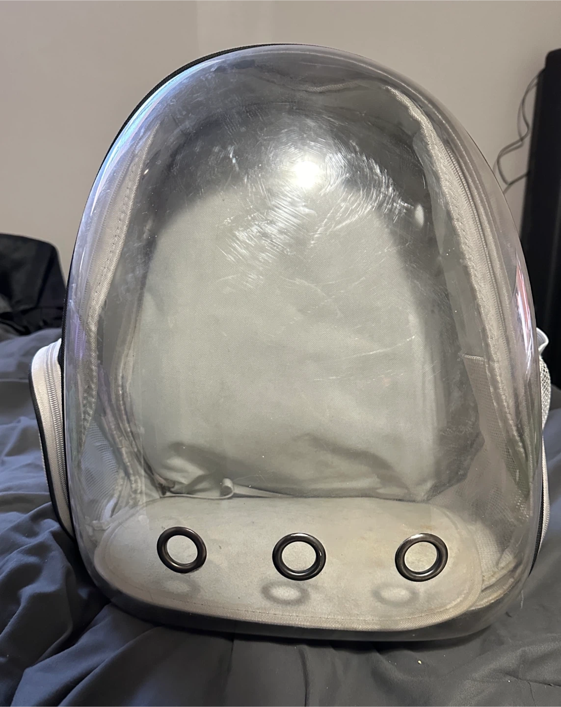 Selling a pet carrier backpack with a space capsule design! It's perfect for taking your furry friend on adventures. The backpack is clear, so your pet can see everything around them, and it has plenty of ventilation to keep them comfortable. It's in great condition and ready for a new home!