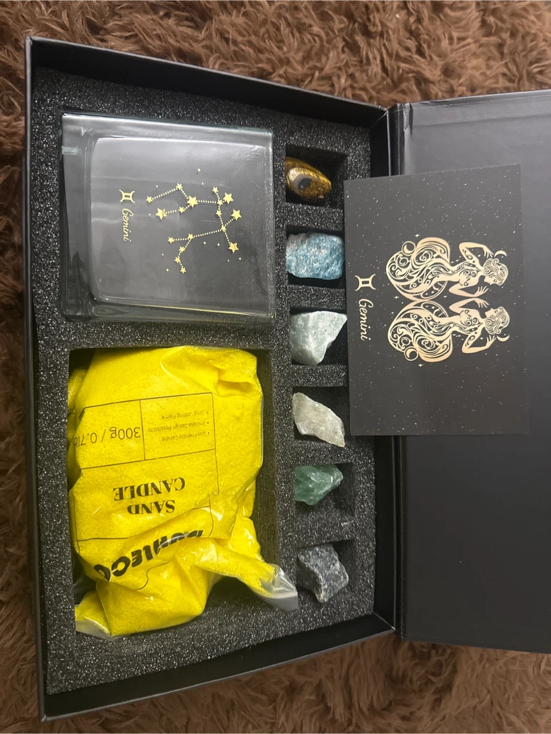 Selling a Perfect Gemini sand candle kit! It includes the sand candle, gemstones, and Gemini-themed cards. It's an eco-friendly candle with endless design possibilities and a long-lasting flame. The sand candle weighs 300g / 0.71b