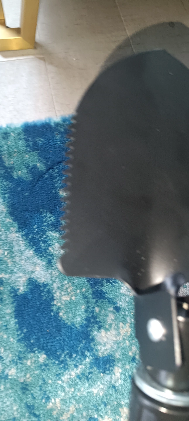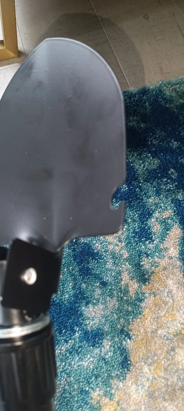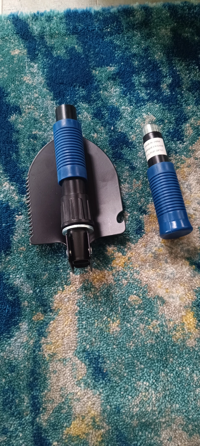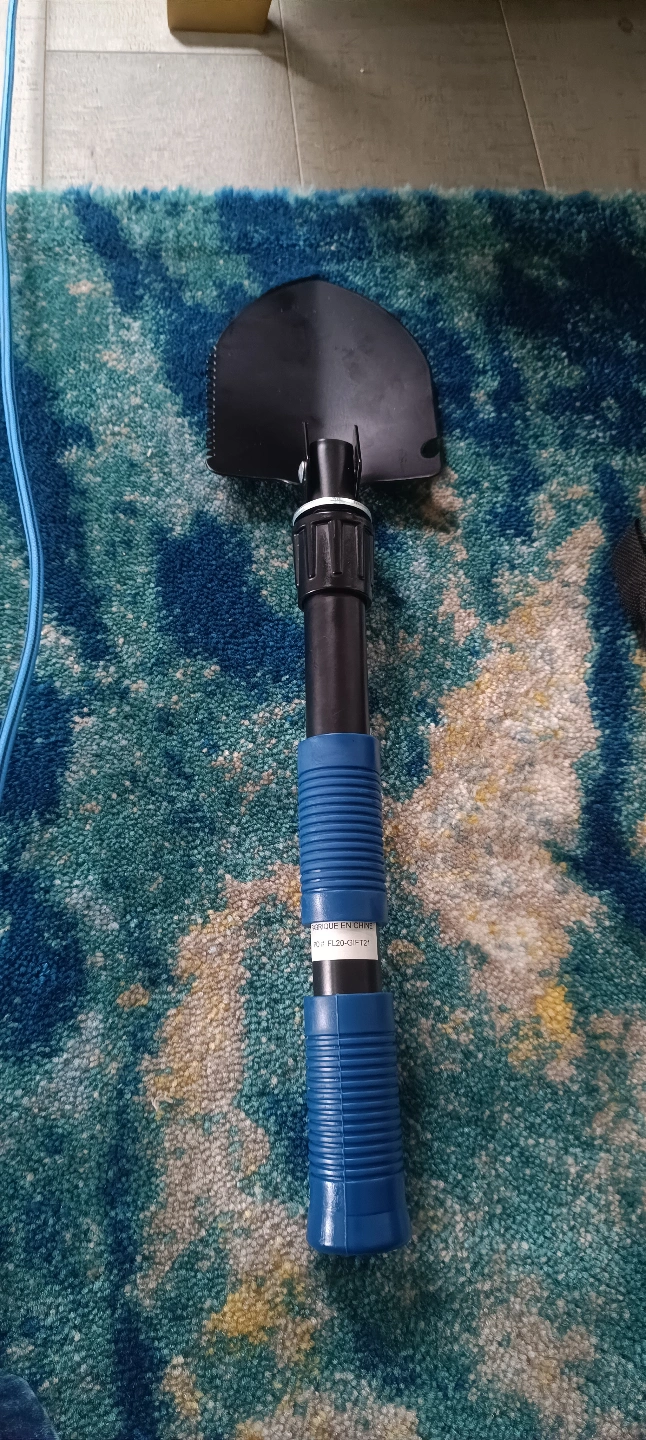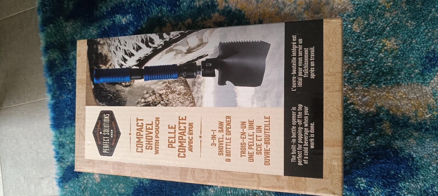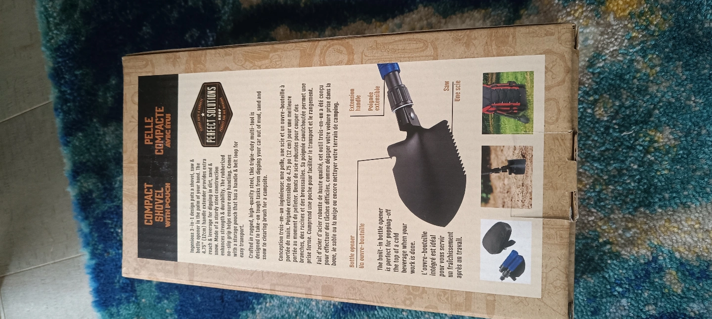 86Perfect Solutions brand compact shovel. Three-in-one design: shovel, saw, bottle opener. Includes carrying pouch. Durable construction. Collapsible for easy storage.
