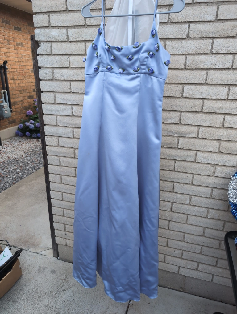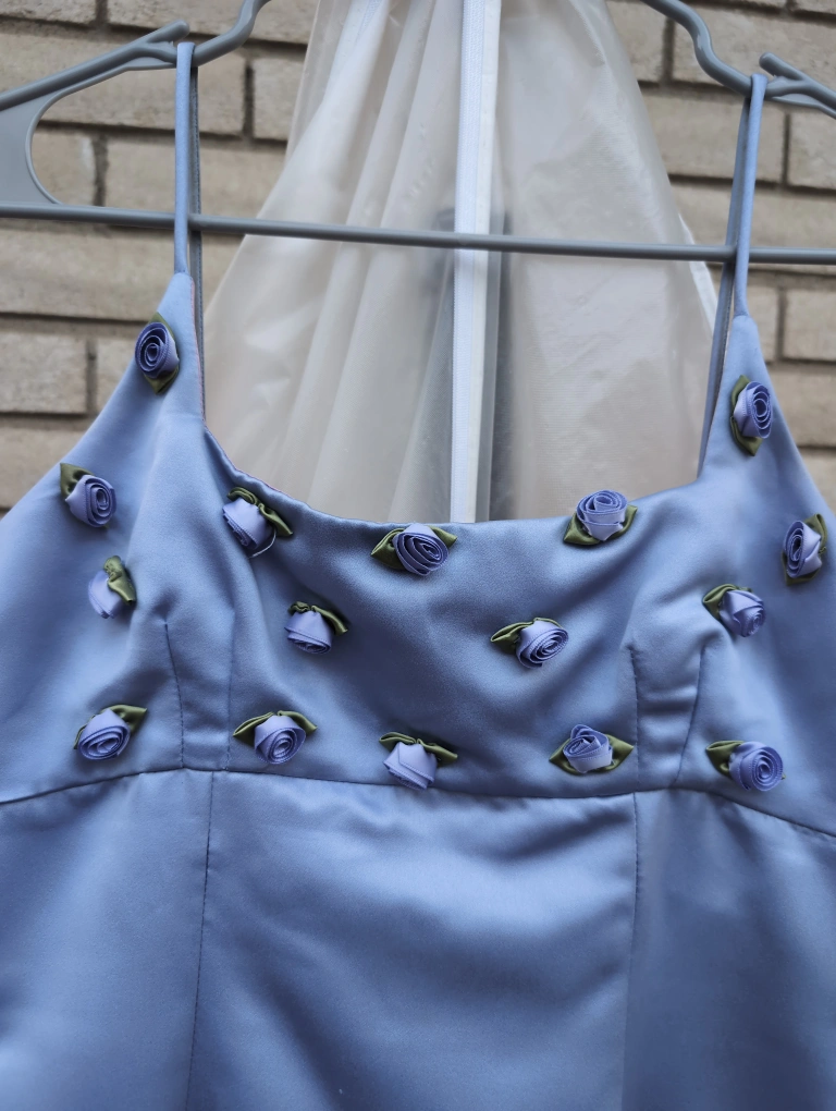 A lovely blue formal dress! It has a satin-like material and cute floral details near the top. Perfect for a special occasion! size small.with petticoat underneath. only worn once. call 519-991-5620