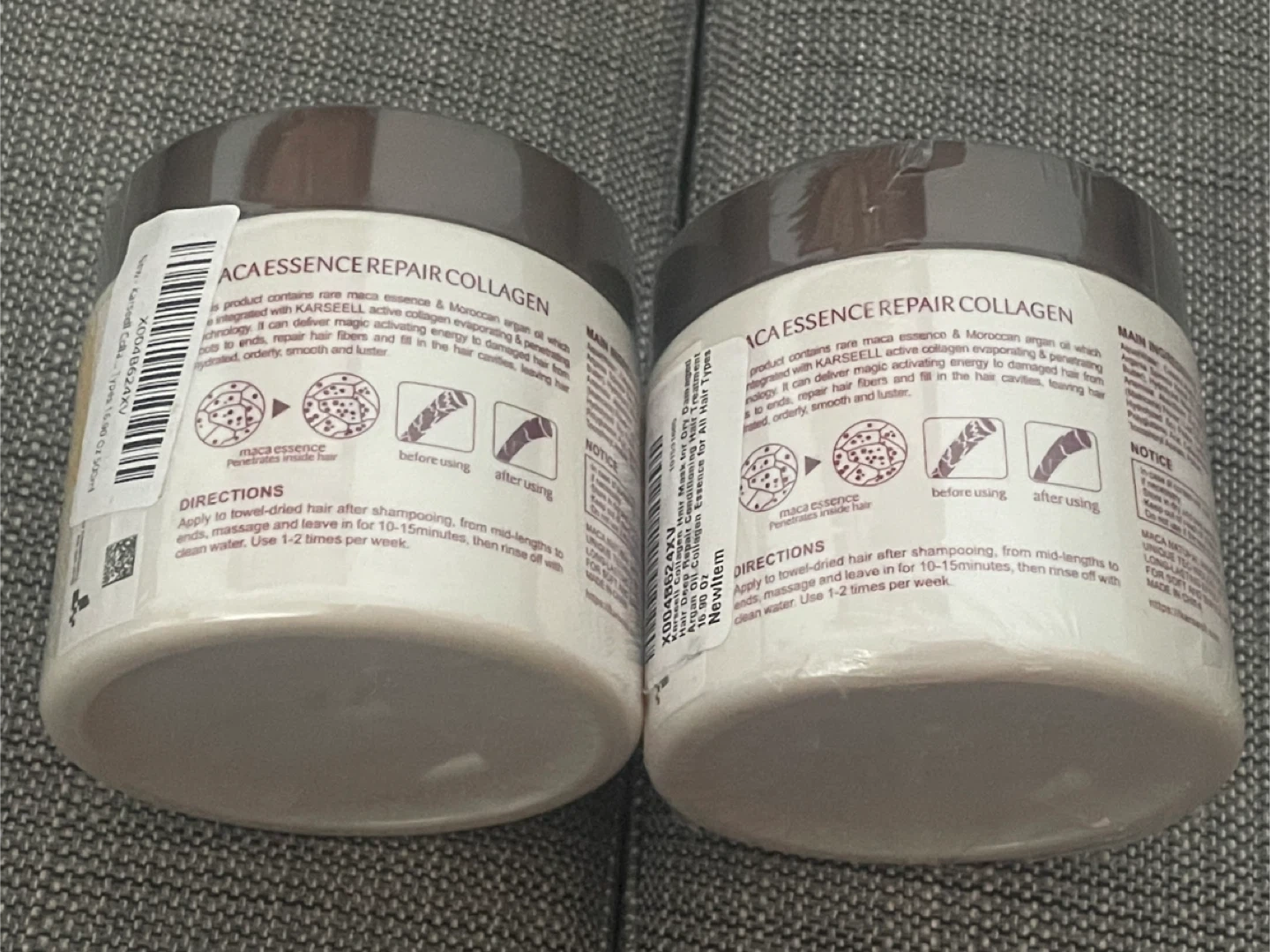 This is a 2-pack of Karseell Maca Essence Repair Collagen hair mask. Each jar is 500ml/16.9fl.oz. It's designed for dry, damaged hair. The mask penetrates chemically treated hair and relaxes the scalp.
