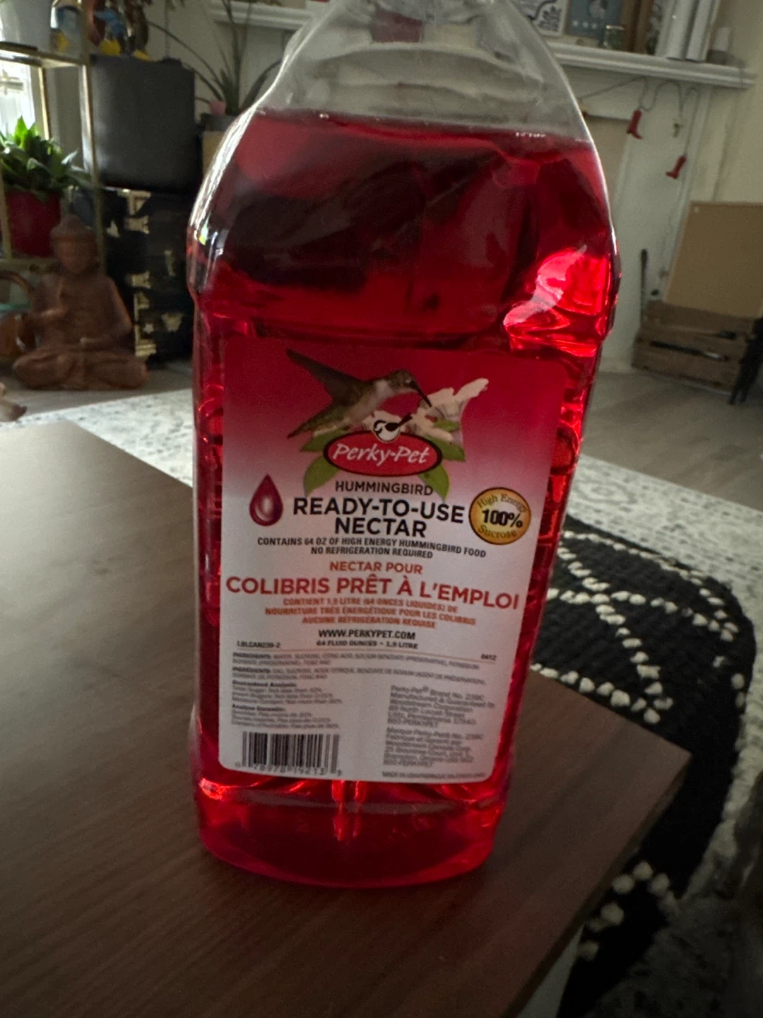 FREE! A bottle of Perky-Pet Hummingbird Ready-To-Use Nectar. It contains 64 oz of high energy hummingbird food and requires no refrigeration. Contains 1.9 Litre