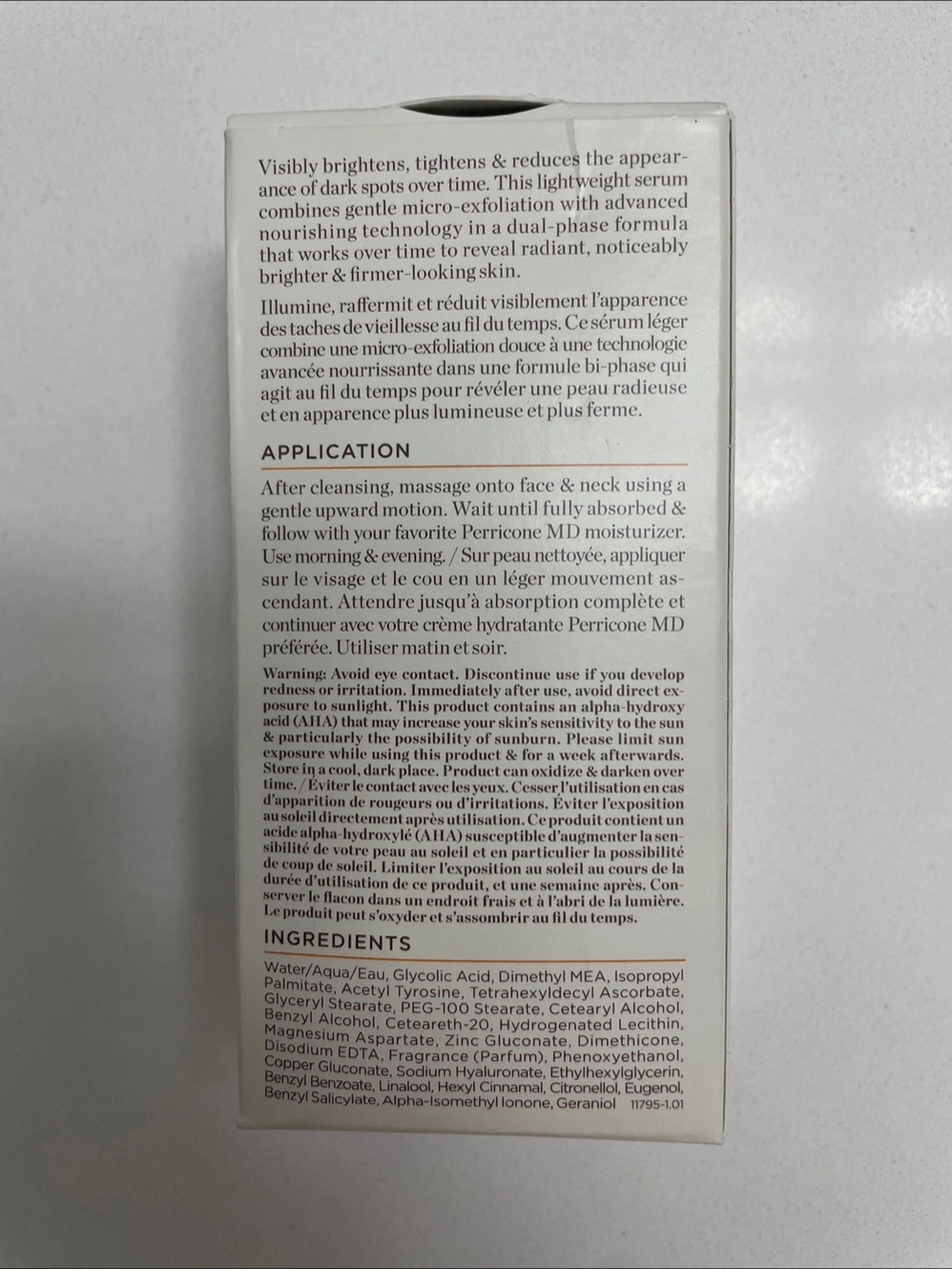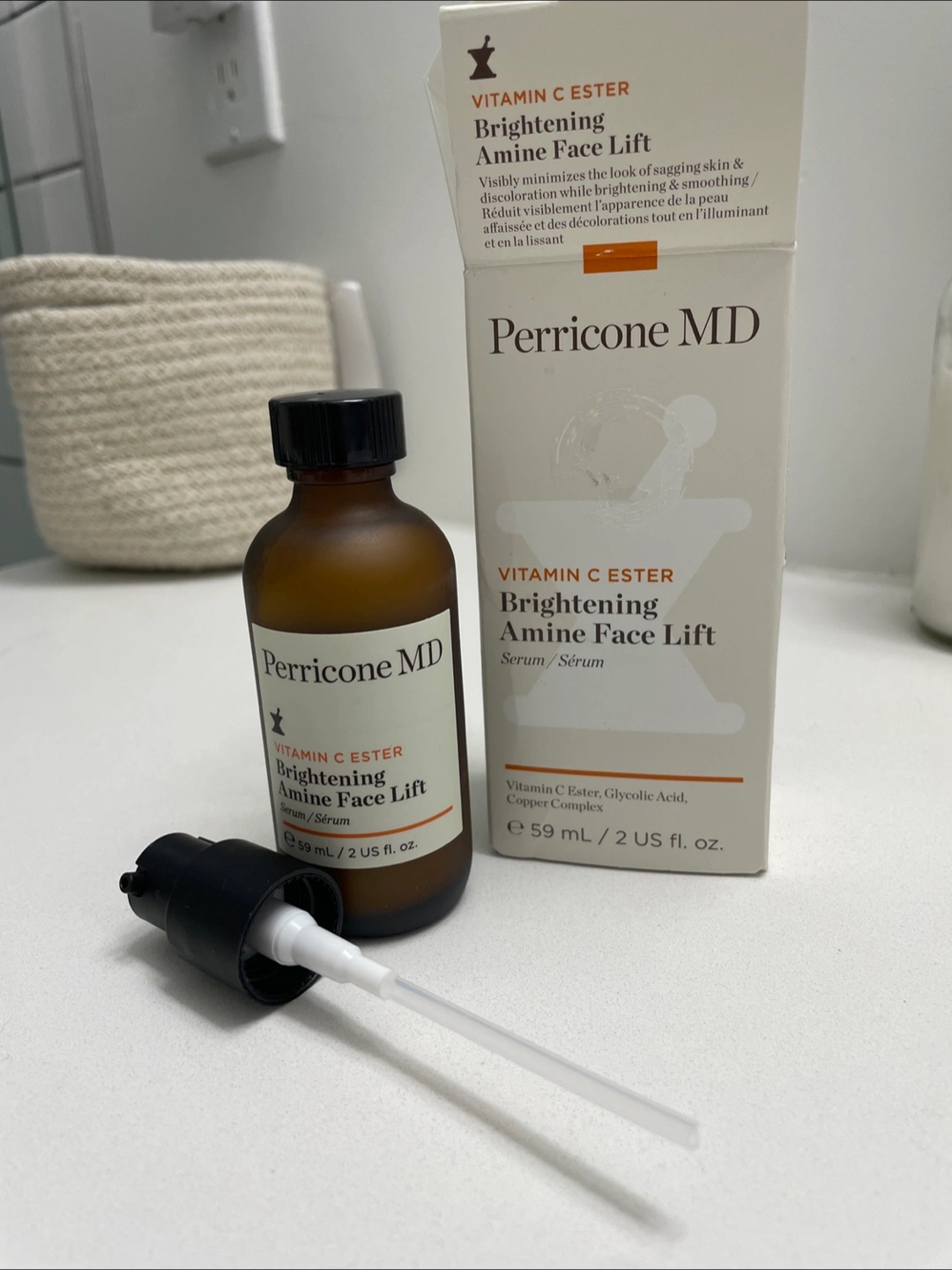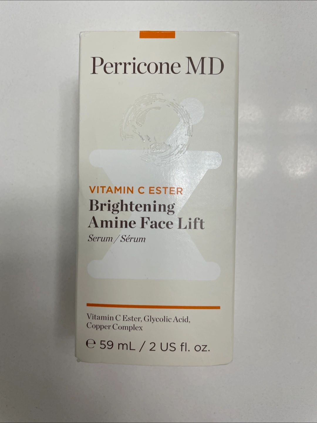 Brand new in box - never used. Switching my regime up. This lightweight, fast absorbing vitamin C serum visibly minimizes the look of discoloration and sagging skin while brightening and smoothing. Visibly brightens, tightens and reduces the appearance of dark spots over time. This lightweight, fast-absorbing serum combines gentle micro-exfoliation with advanced nourishing technology in a dual-phase formula that works instantly and over time to reveal radiant, noticeably clearer and firmer-looking skin What It Does: Designed to help lift and tone the skin's appearance. Delivers firmer-looking skin while smoothing the appearance of lines and wrinkles. Visibly evens skin tone imparting a natural radiance. What To Expect: Due to the science and compounds used in our products the feel and scent may vary. Texture: Serum Consistency: Lightweight Scent: Fresh & Aromatic * This product is free from gluten, fish, milk, phthalates, sulfates, parabens, oil, talc, and mineral oil. Cruelty-free and 100% vegan. Sold out online! https://www.perriconemd.com/p/brightening-amine-face-lift/11833546/