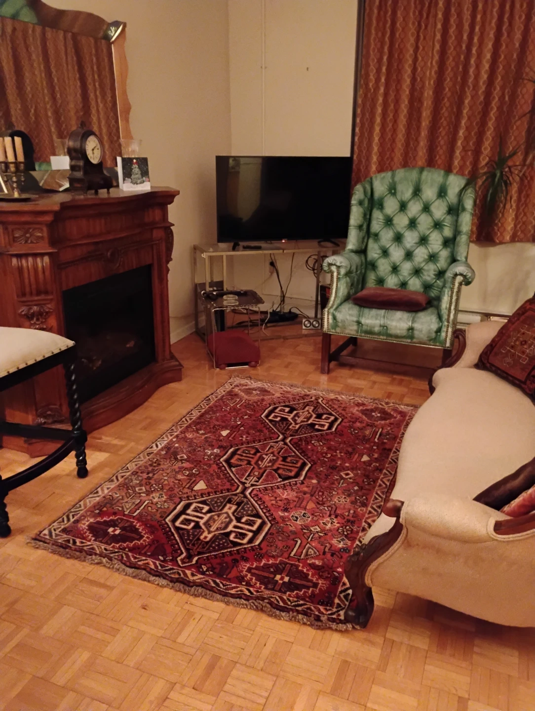 177Lovely Persian rug 350. Wingback parlour Chair 200.00