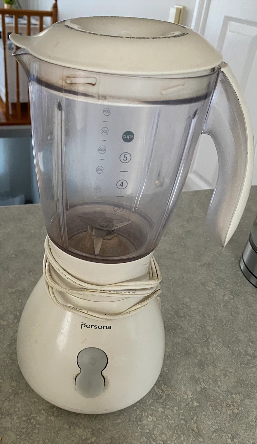 Selling a Persona blender. It has a clear pitcher with cup measurements on the side. The base is white. It's in used condition, but still works great!