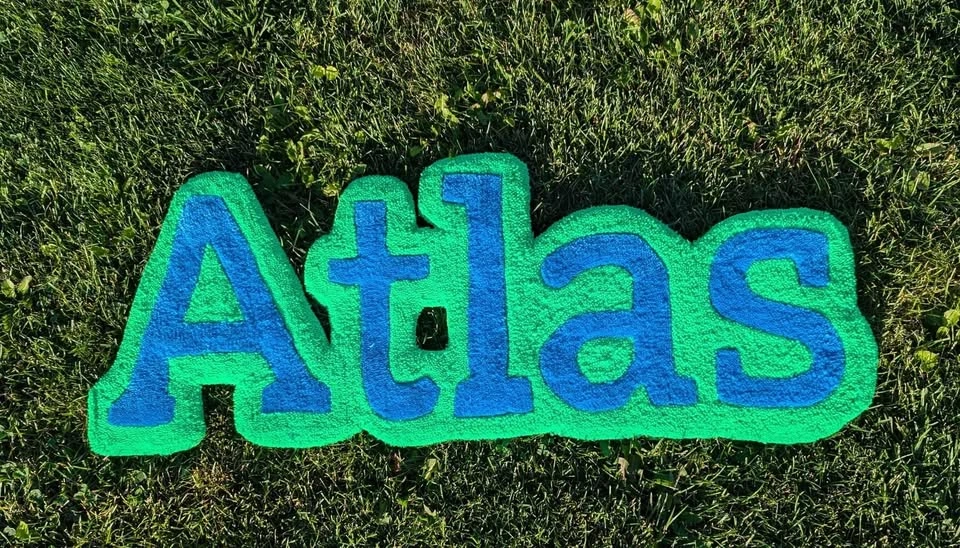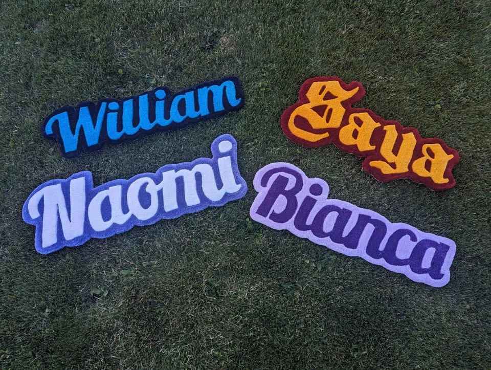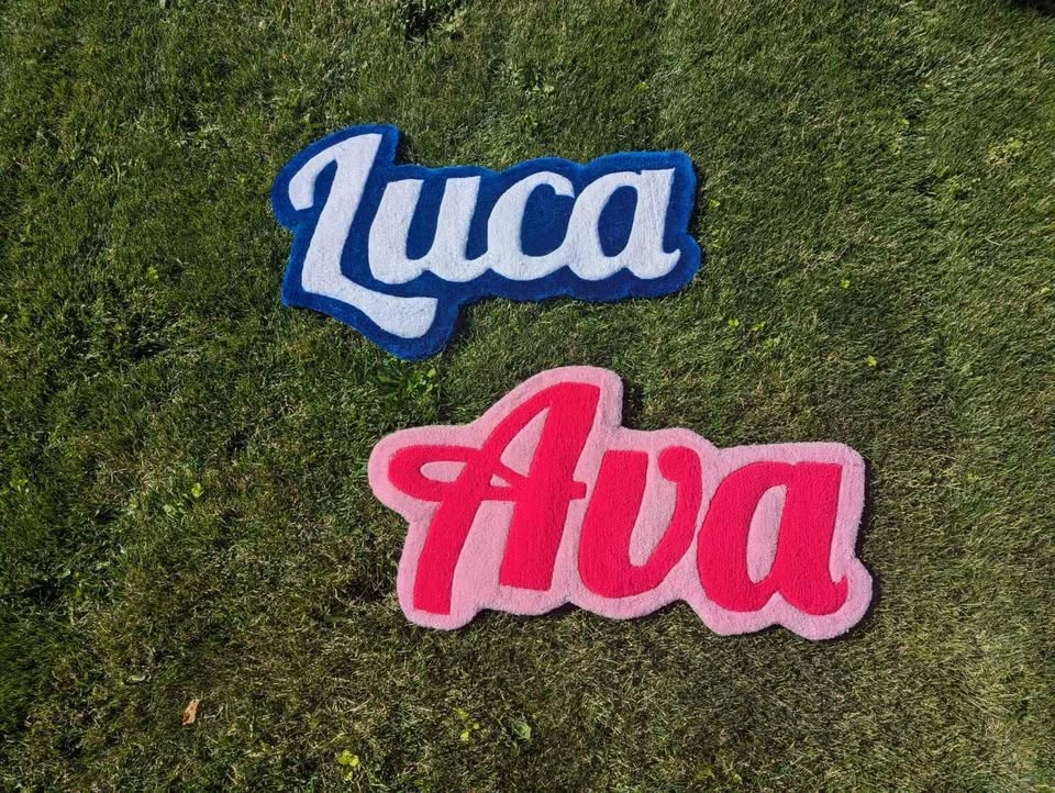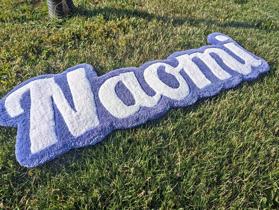 Looking for a great Gift idea? Look no further! These name tag rugs are the perfect gift for any occasion! I charge $20 per letter + $5 per color. I also do custom art pieces (msg for more info). Check us out on Instagram @6ix_rugs For reference the "Naomi" rug (in pictures) is 34"x12". It's 5 letters with 2 colors. 20 x 5 + 10 = $110 Size options 3. Size of Rug (Height; Length determined by number of letters): 12 inches – $20 per letter + $10 for 2 colors 16 inches – $40 per letter + $20 for 2 colors 22 inches – $60 per letter + $30 for 2 colors