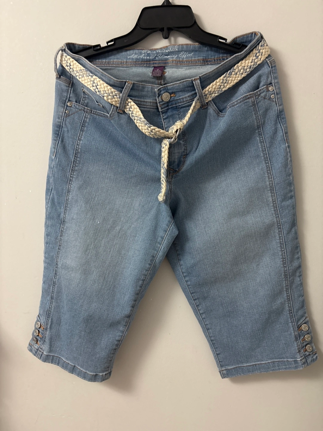 Light wash denim caprice Includes a braided belt. Button accents at the hem. Size 10