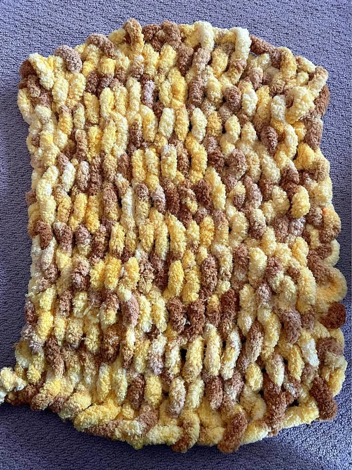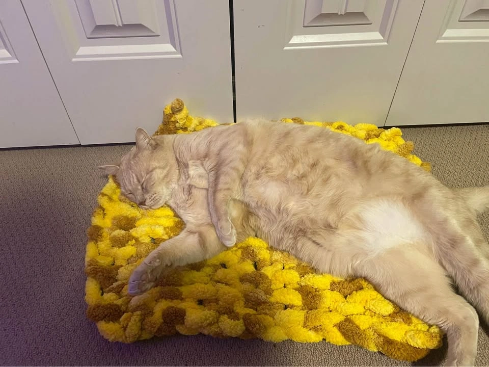 10Cat approved, hand knit pet blanket, approximately 17x22 inches. Wonderful bed cover for cats and small dogs, keeping them cozy for hours. Yellow and brown pictured, but many other colours available.