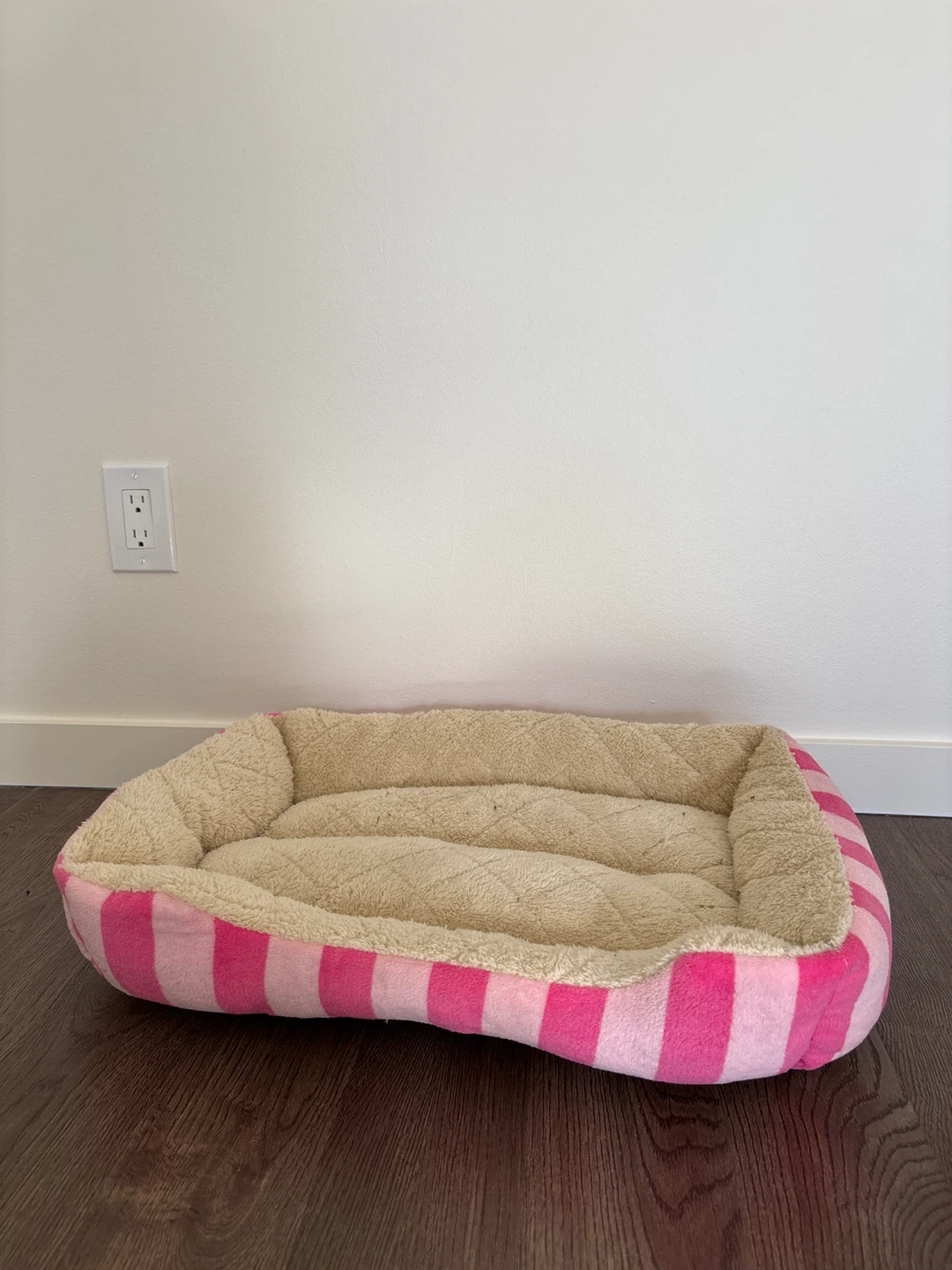 Selling a comfy pet bed with a pink and white striped pattern. It's in great shape and ready for a new furry friend! The inside is a soft, plush material, perfect for cozy naps.
