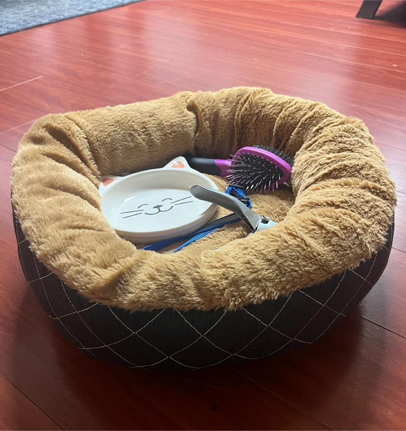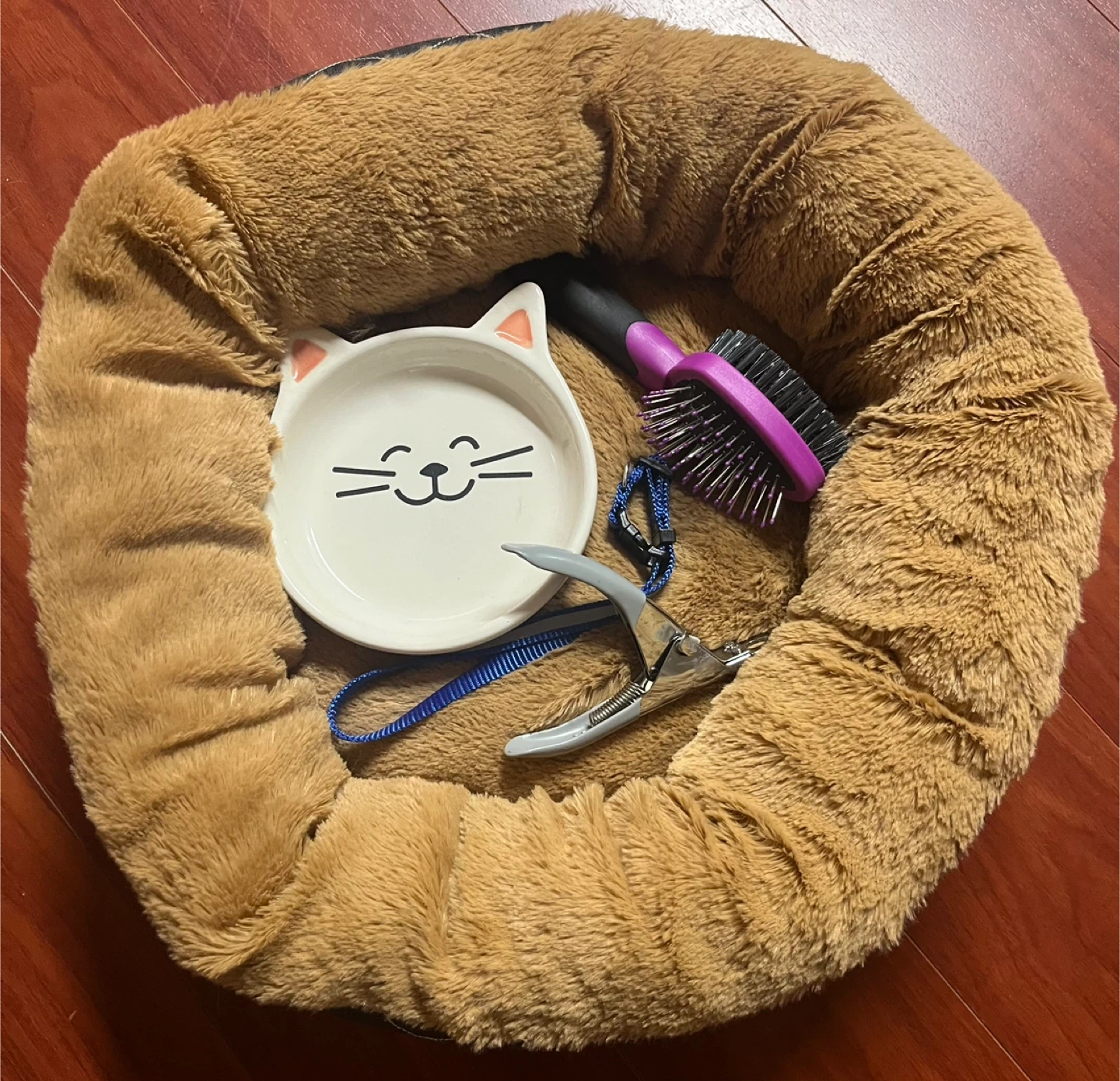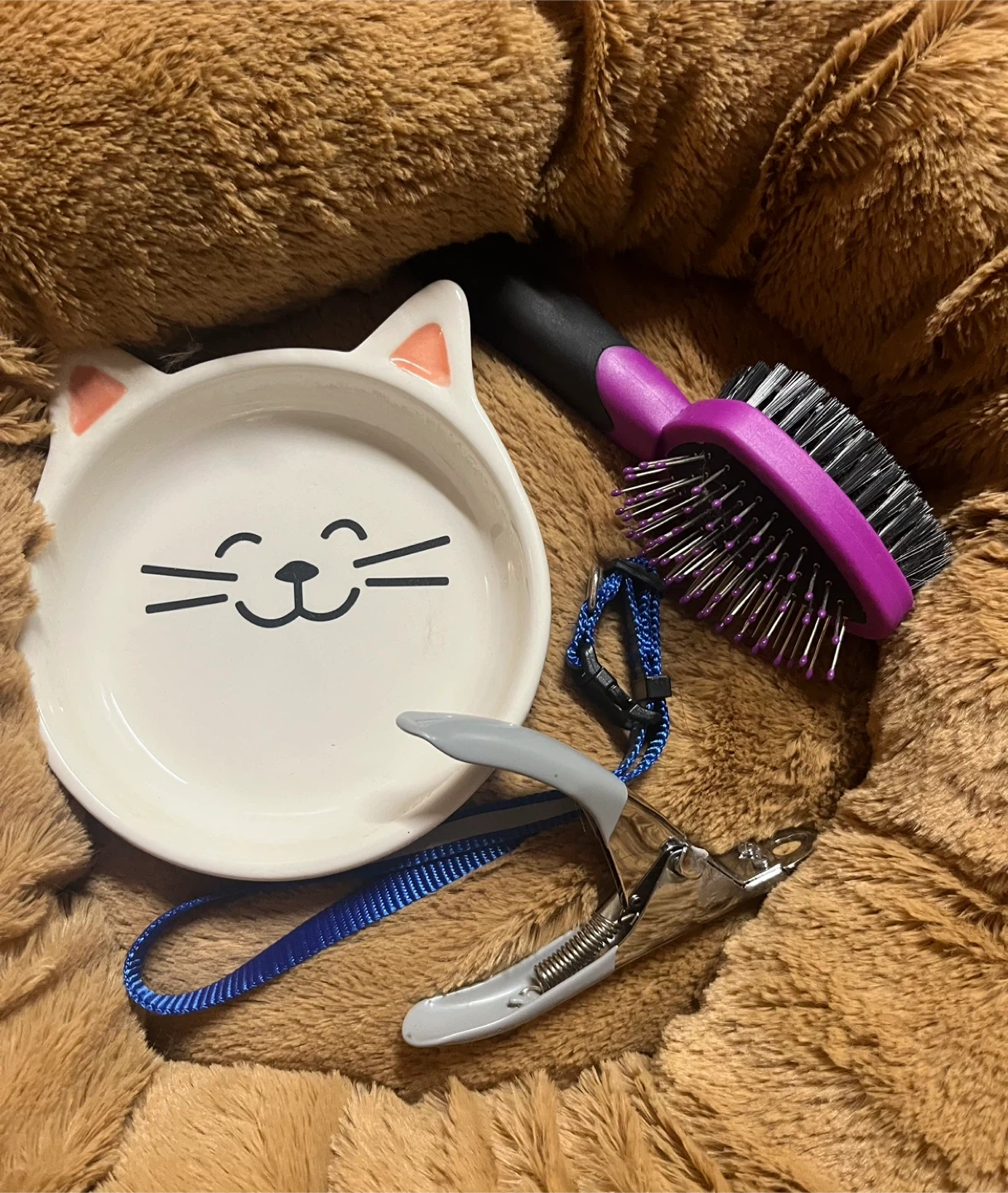 Selling a cozy pet bed with a cute cat-themed bowl, a brush, and nail clippers for your furry friend! The bed is a soft, plush material, perfect for a comfy nap. The bowl is ceramic and features an adorable cat face design. The brush and clippers are great for grooming too!