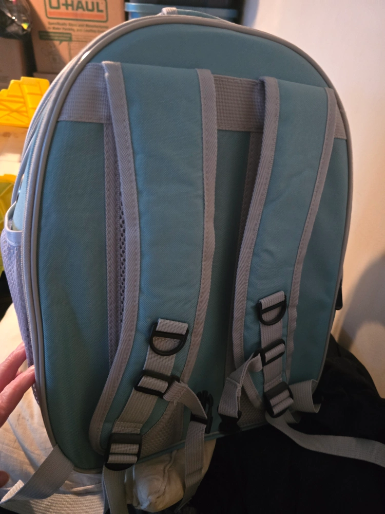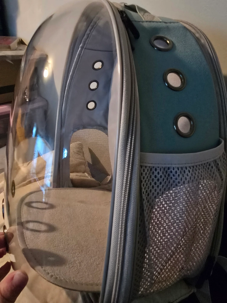 Looking to sell a pet carrier backpack. It's in great condition only used 2 times.. and perfect for taking your furry friend on adventures! It features a clear bubble window and mesh sides for ventilation and visibility. The colour is light blue.