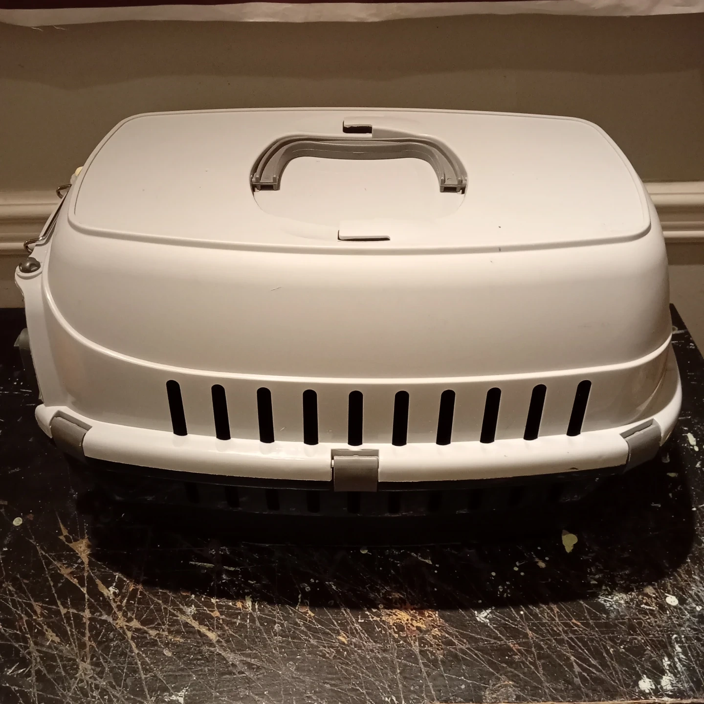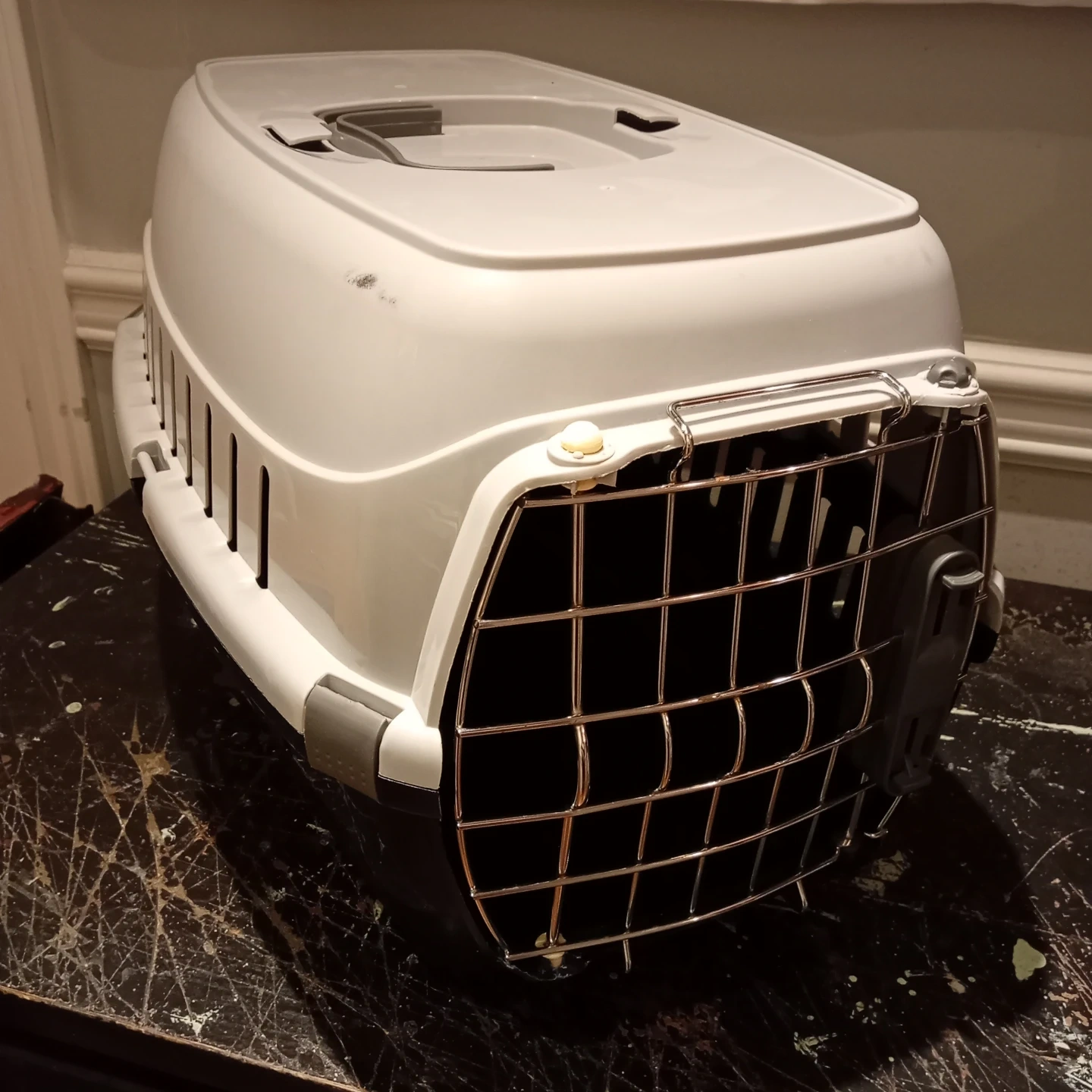 60Selling a pet carrier suitable for a cat or small dog. It's in good condition and ready for its next adventure! It is a hard-sided carrier with a metal grate door.